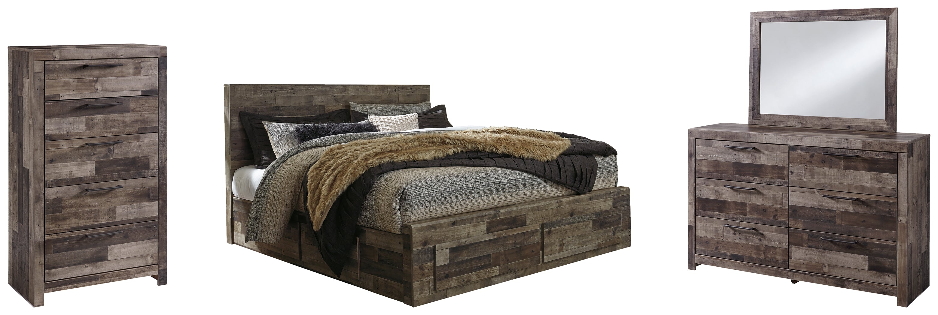 Derekson King Panel Bed with 6 Storage Drawers with Mirrored Dresser and Chest in Multi Gray