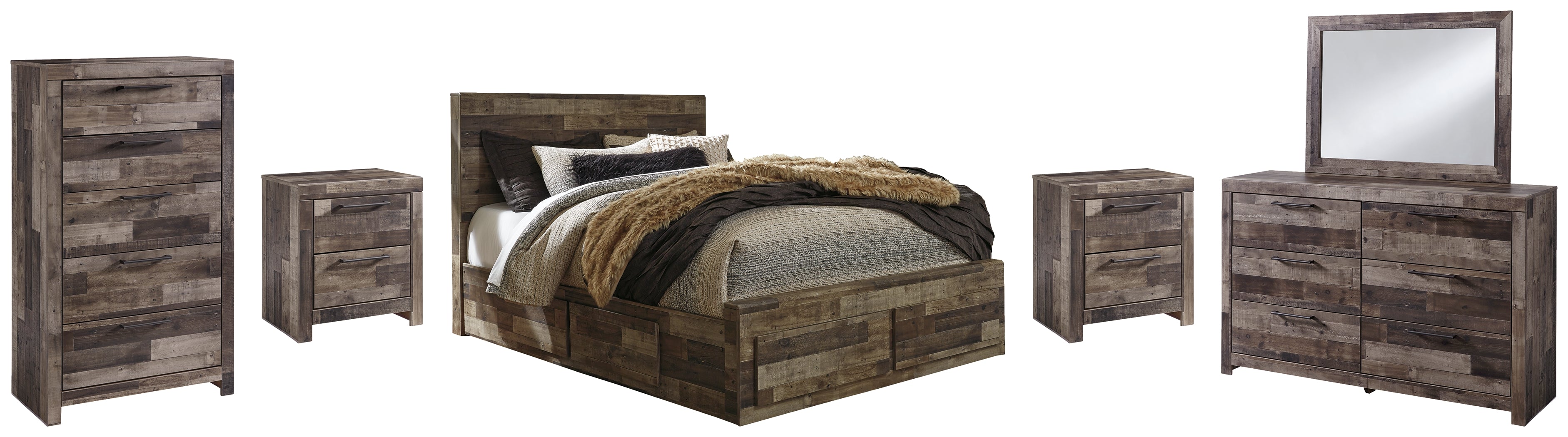 Derekson Queen Panel Bed with 4 Storage Drawers with Mirrored Dresser, Chest and 2 Nightstands in Multi Gray