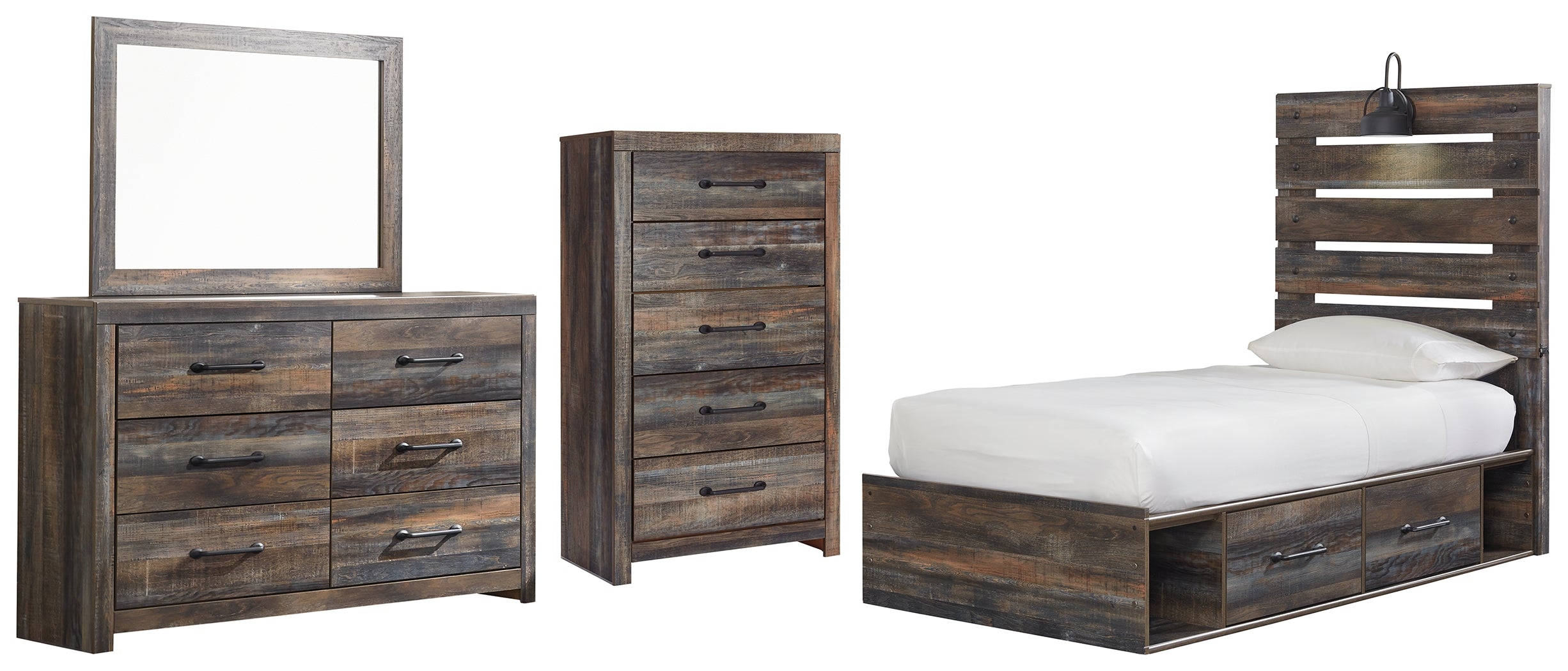 Drystan Twin Panel Bed with 4 Storage Drawers with Mirrored Dresser and Chest in Multi