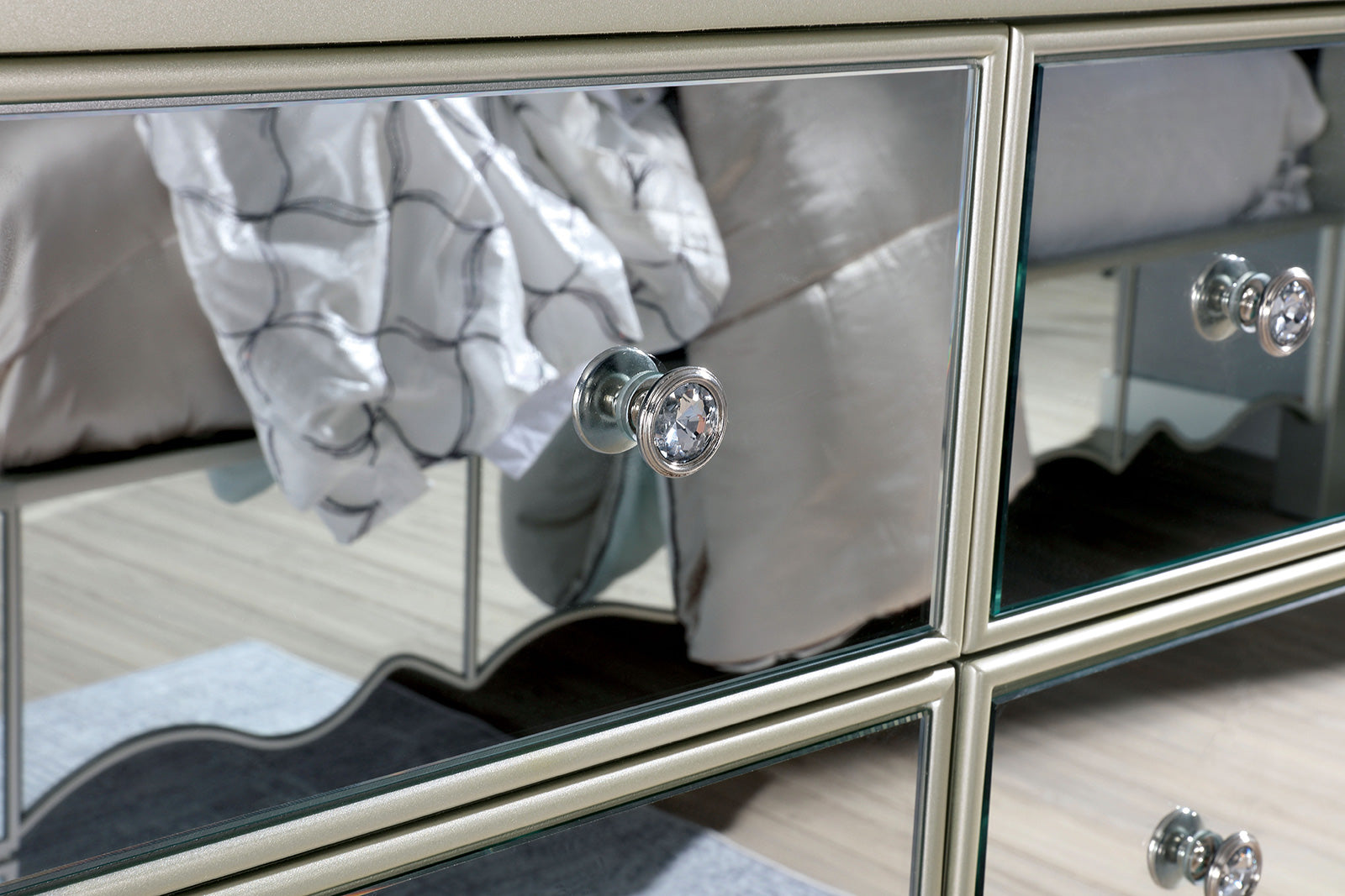 Glamor and shine have never looked as good as it does with this dresser from the Eliora Collection. With its silver finish and crystal drawer knobs, everything about this dresser sparkles. Its ornate accents and curved feet will make you feel like royalty.