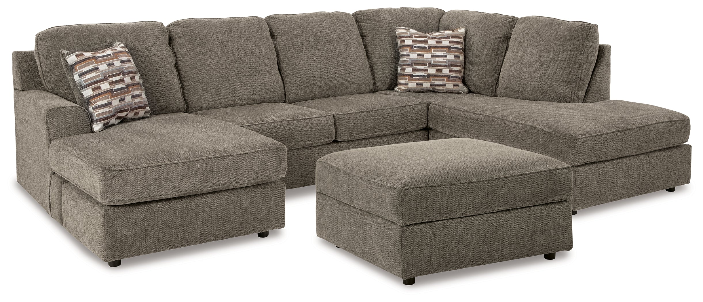 Includes 2-piece sectional (left-arm facing sofa chaise and right-arm facing corner chaise) and storage ottoman