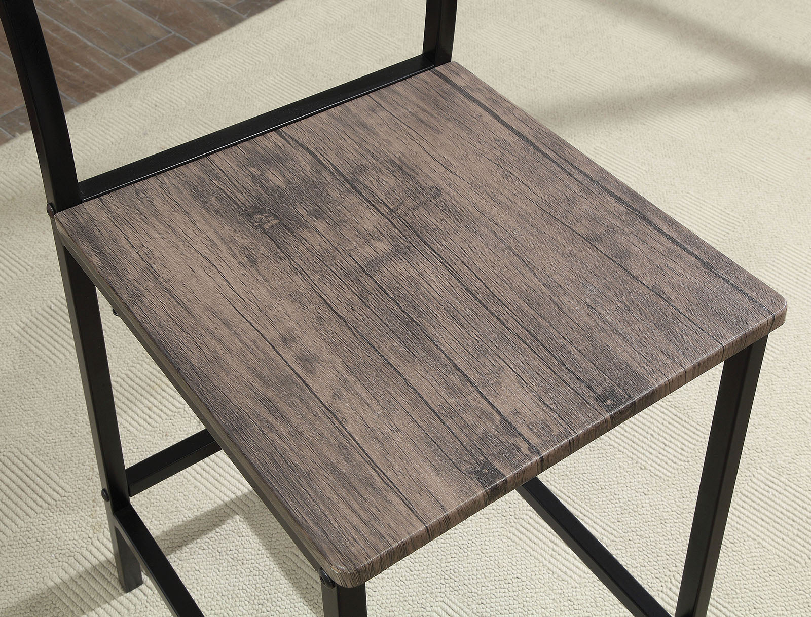 This humbly designed dining set is a great addition to any restoration-decorated dining space. The metal legs and chair frames contrast beautifully with the wooden table top and seats, to make for a plain handmade aesthetic. The weathered seats of the chairs complement the design and add contrast to the dark metal frame. Ideal for family meals, this table set showcases casual comfort and reliable support to last for years to come.