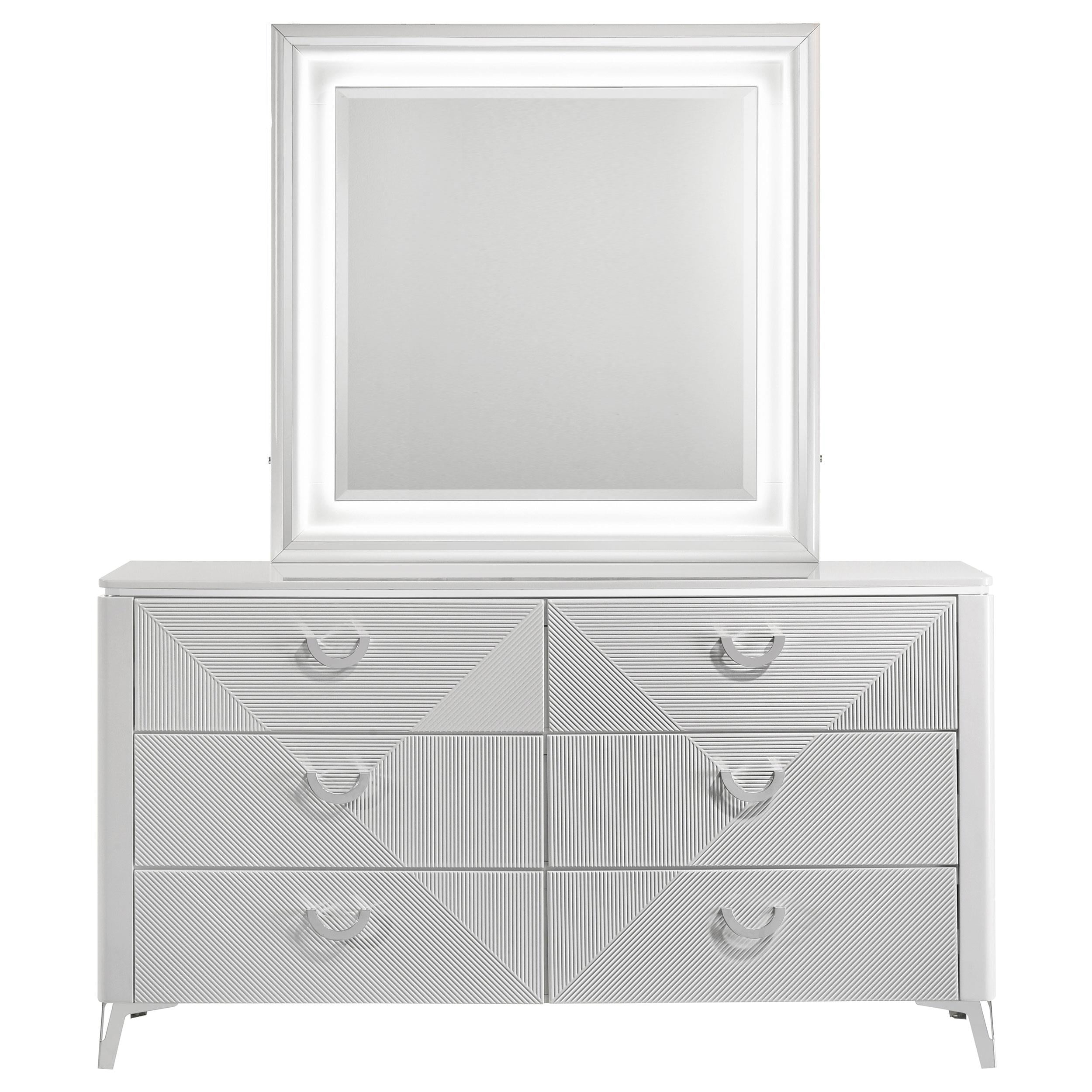 Sophisticated and dimensional, this six-drawer dresser and mirror set makes a bold statement in a high-gloss white finish. The dresser features geometric drawer fronts with fine ribbed texture forming inverted V patterns, paired with polished chrome U-shaped pulls. Black felt lines the top drawers for a touch of refinement, while 45mm ball bearing glides ensure smooth operation. Above, the matching mirror glows with integrated white LED trim for ambient lighting and crisp contrast.