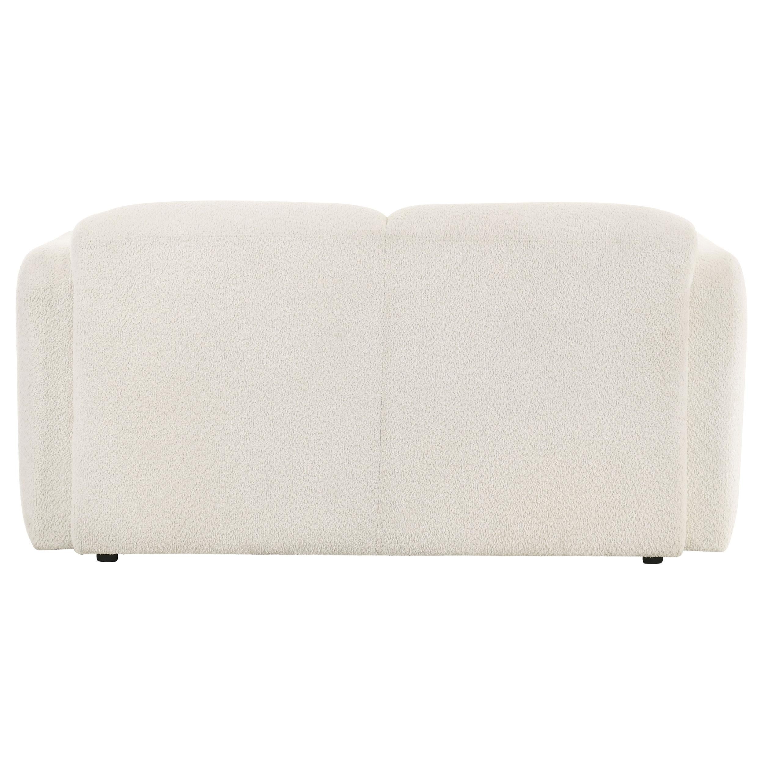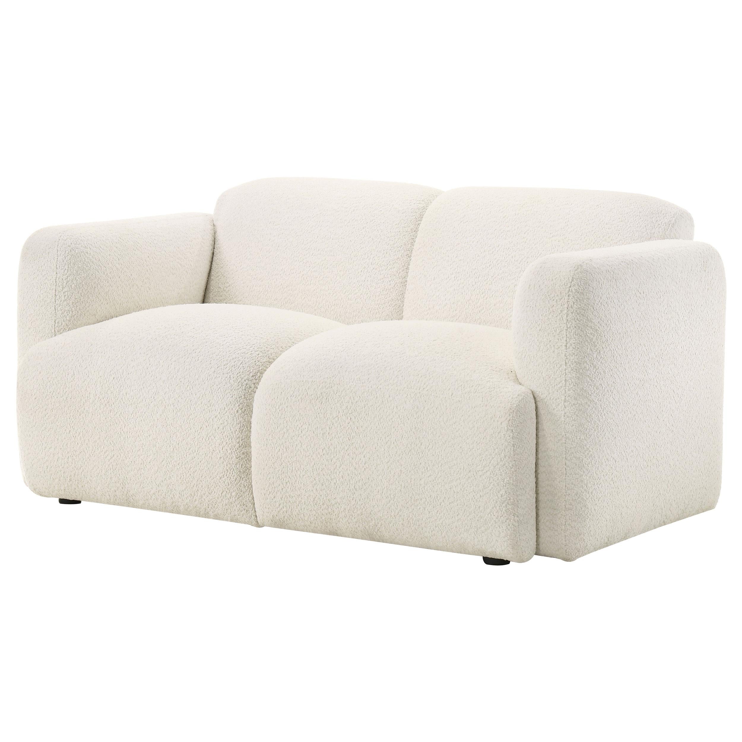 This sculpted loveseat brings bold softness and inviting texture to modern spaces. Its low-profile frame is wrapped in richly textured fabric with a cozy, tactile feel. Rounded track arms and a smooth, contoured silhouette create a cocoon of comfort. High-quality foam and pocket coil seating ensure long-lasting support without sacrificing softness. With a clean, minimal form, this two-seat loveseat adds warmth and refined presence to any living room or lounge.