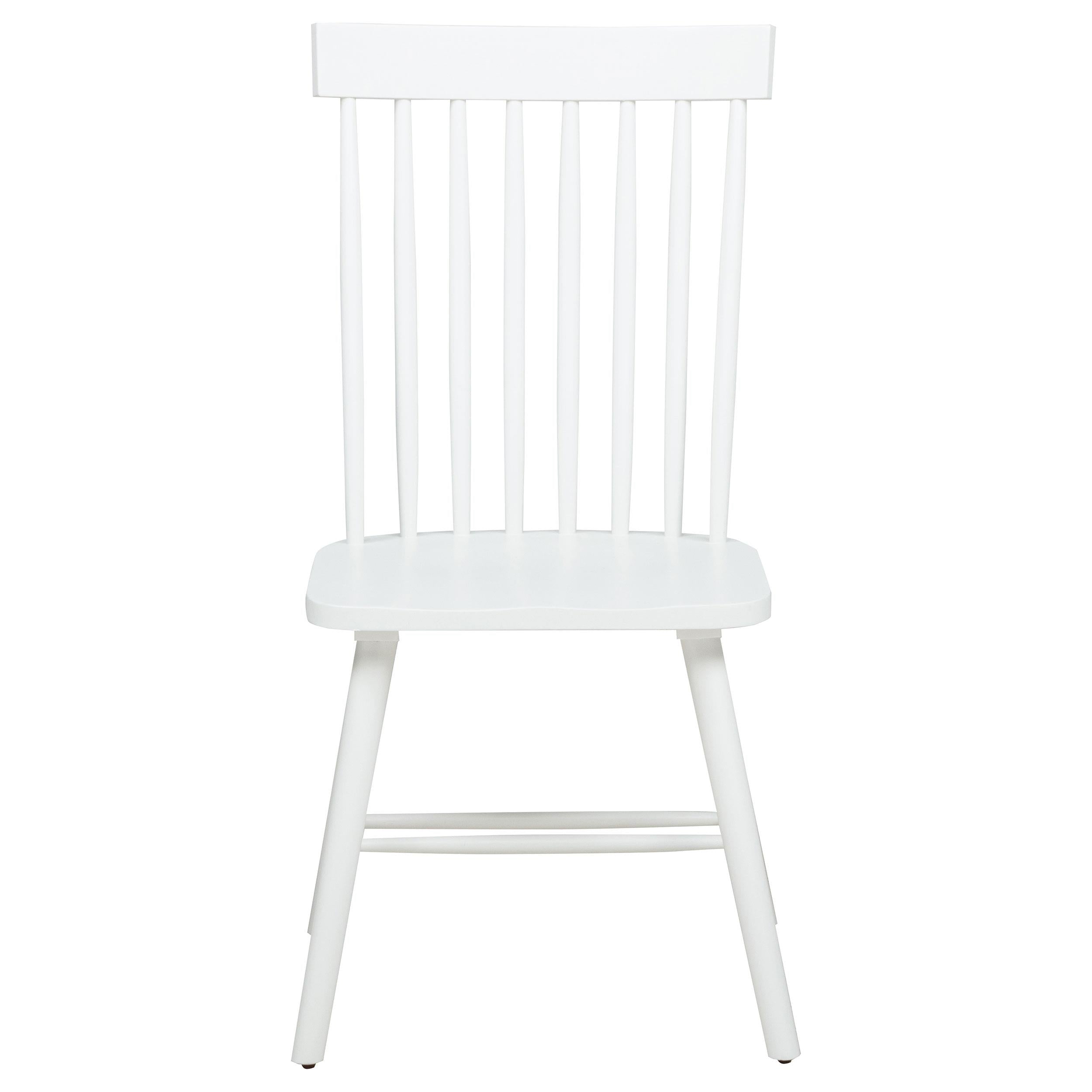 Classic and casual with a fresh farmhouse flair, this Windsor-style side chair features a high spindle back and gently contoured seat for timeless comfort. The clean silhouette is crafted from solid rubberwood with a rich wood veneer that enhances its natural grain. Angled legs with double stretchers offer reliable support and charm. Ideal for everyday dining, breakfast nooks, or cozy kitchen spaces.