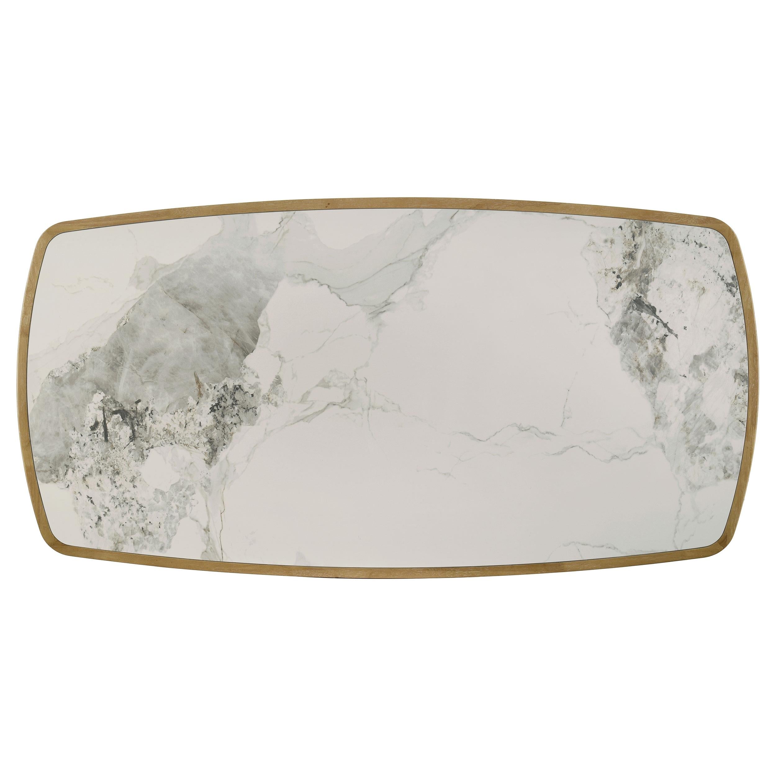 This mid-century inspired dining table blends sculptural elegance with modern innovation. The rectangular tabletop features a recessed ceramic inlay with natural marbling in tones of off white, gray, and amber brown, resistant to heat and stains with an impermeable, easy-clean surface. A softly curved solid wood frame in weathered natural finish surrounds the top, supported by angular legs with slatted stretchers for added character. Crafted from rubberwood and durable composites, it seats six comfortably for everyday dining.