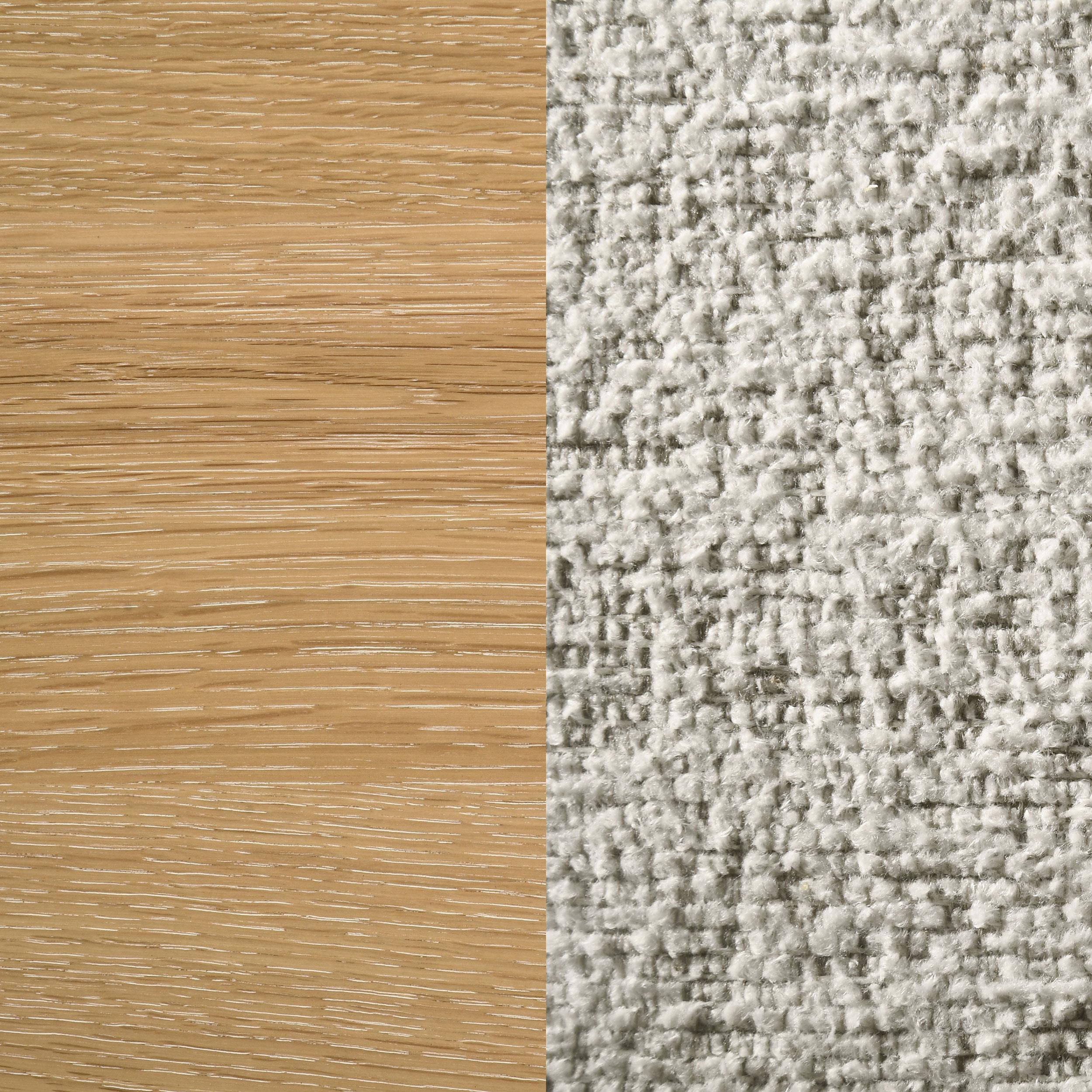 This ladder back dining side chair offers a relaxed blend of rustic character and contemporary ease. Crafted from solid wood in a washed oak finish, it features softly rounded posts and legs that bring warmth without ornate details. The cushioned seat is upholstered in a cozy oatmeal-colored bouclé fabric, providing both textural charm and everyday comfort. Built to support daily use, its clean silhouette and sturdy construction make it a versatile and enduring seating choice.