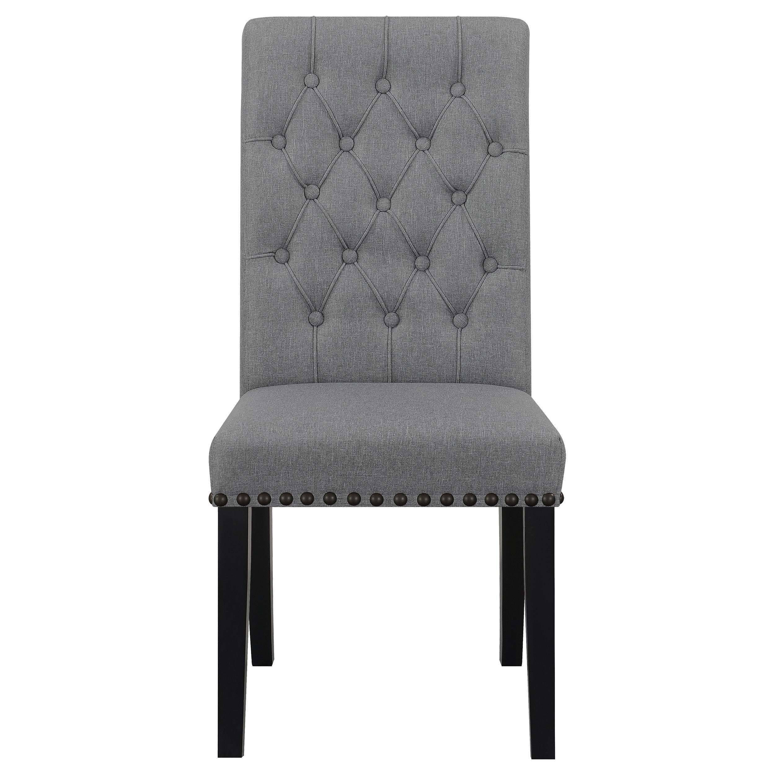 Bring together family and friends at this modern rustic style dining table set. The table features a rectangular, thick, white marble top that is spacious enough for six people. Sleek open and airy trestle base with a center punch out, rustic espresso striking color combination lends a dramatic touch and grounds the room elegantly. The set of chairs with a rolled backrest with button-tufted details lends a traditional aesthetic to a space. Also, bringing to your home the classic elements is a padded seat with individual nailhead trim that offers a charming detail.