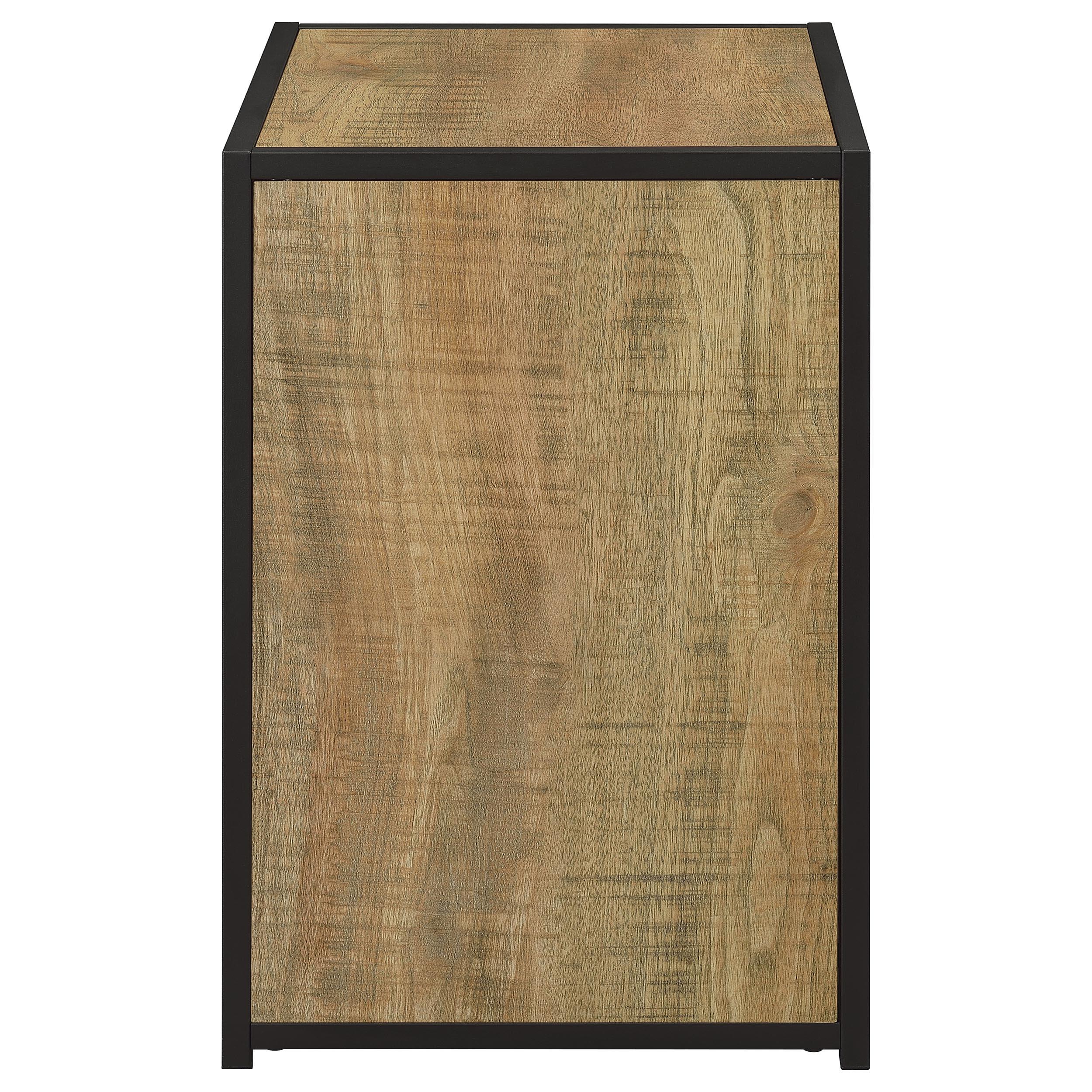 Shoe storage entryway bench with cabinet brings order to the doorway, offering a cushioned seat and concealed space in one clean silhouette. Mango and sandy black contrast lends rustic character. An engineered wood case wrapped in laminate veneer pairs with a sandy black metal frame, with foam padding and black leatherette on top. It tucks neatly beside the door, ready for daily routines. Use the cabinet and open shelf to stage shoes and daily essentials, keeping the entry calm and ready for the next arrival.