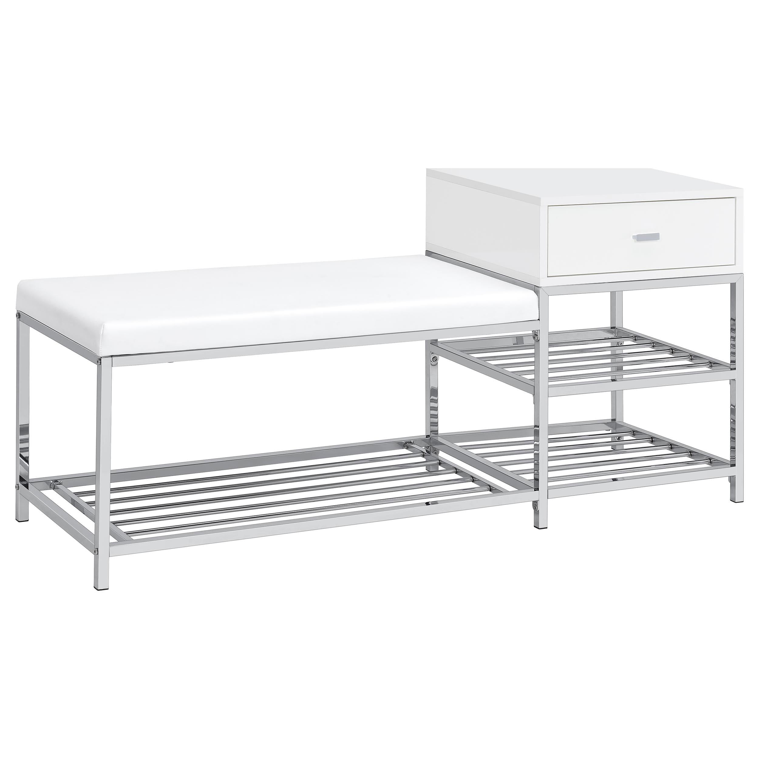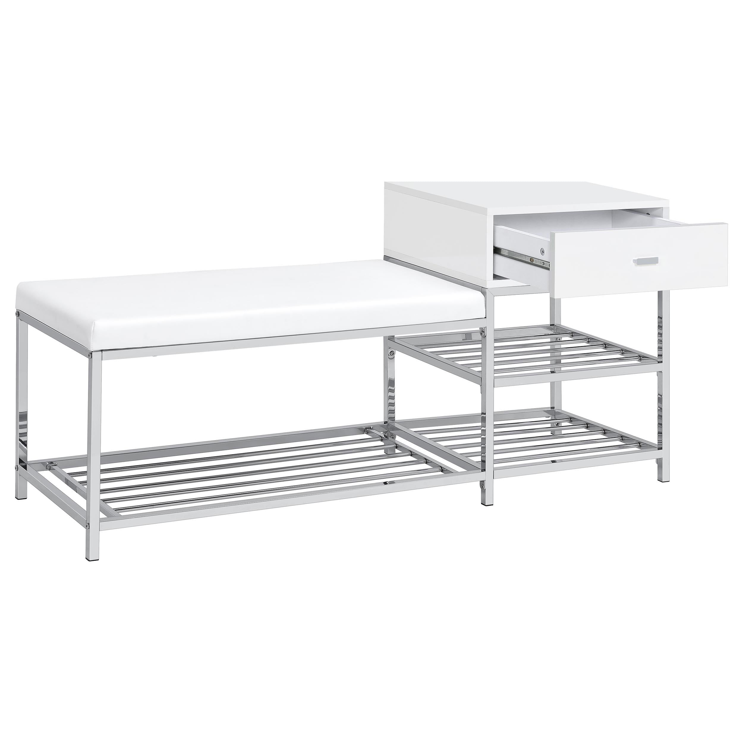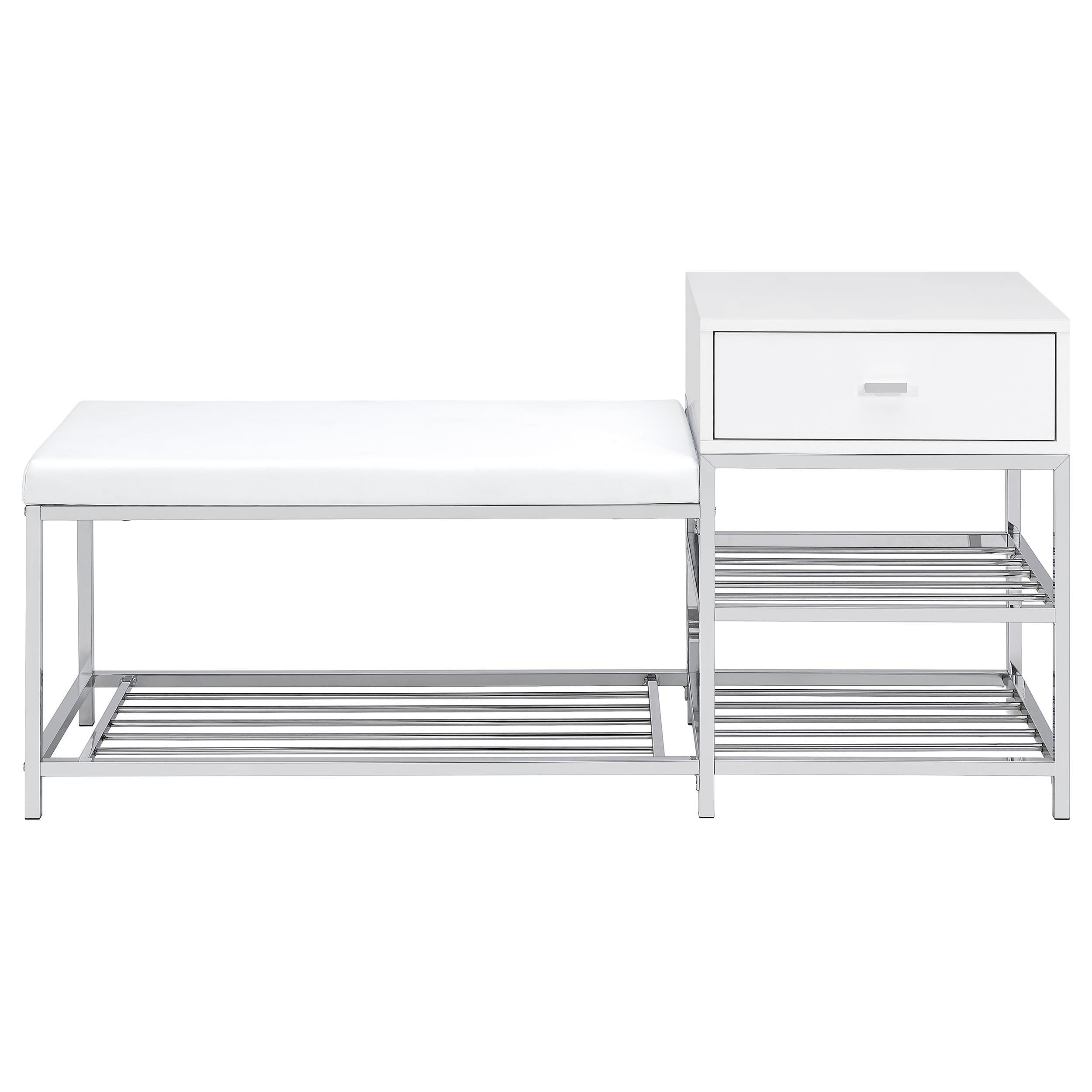 - Item Name: Siega 1-Drawer Shoe Storage Entryway Bench White High Gloss and Chrome by Coaster
