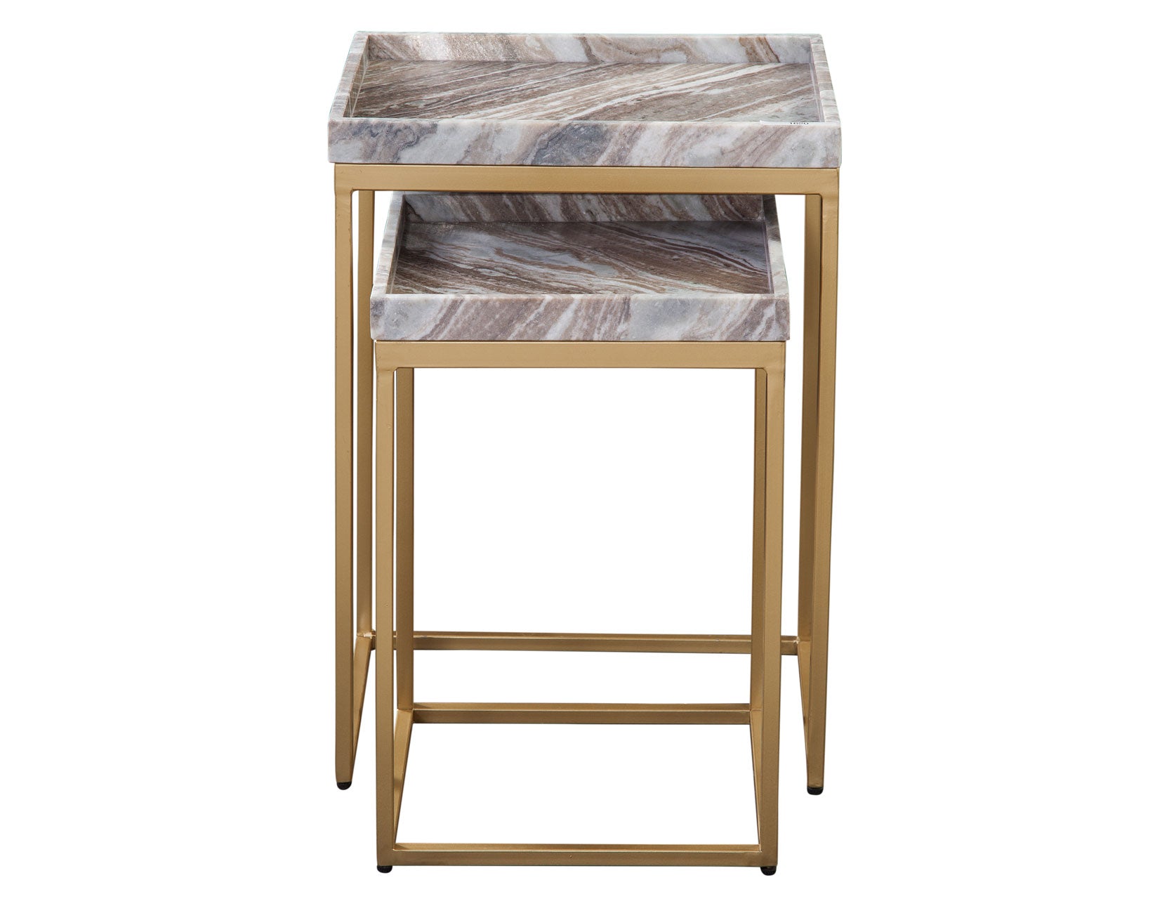Timeless design meets functional elegance. The Chantel Nesting Tables feature solid 0.5″ brown marble tops with a raised lip, beautifully set on powder-coated stained brass iron bases. Each piece showcases unique, natural veining in earthy tones of green, brown, gray, and white. Ideal for compact spaces, they tuck away effortlessly when not in use. Durable, floor-friendly, and easy to assemble—these tables offer both style and versatility for sophisticated interiors.