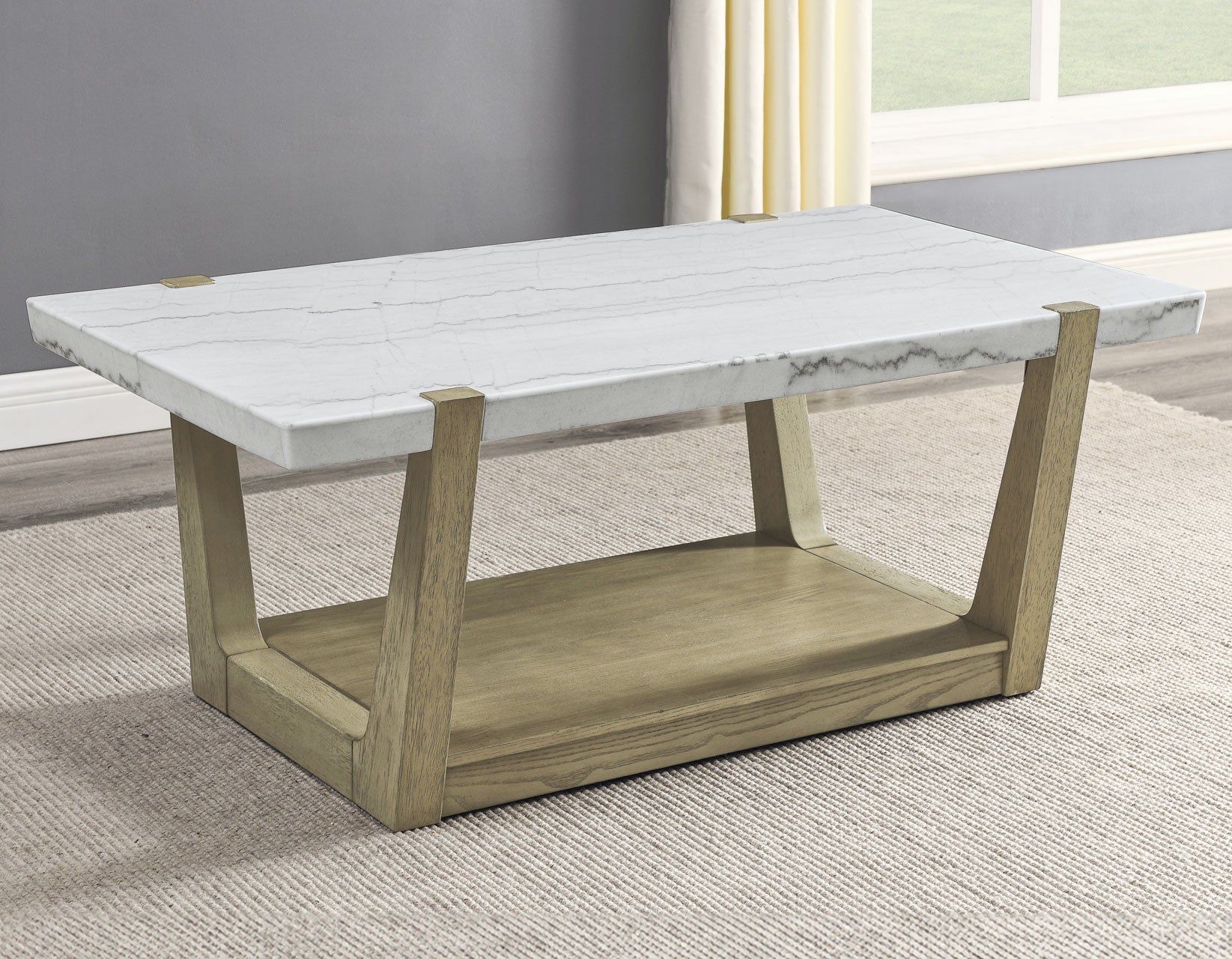 Transform your living room with the Perth Marble Top Table Collection. Crafted with modern flair from ash veneers, hardwood solids, and exquisite white marble tops, each piece exudes sophistication. The weathered sand base from solid wood adds a touch of lightness, while the sturdy legs and clean lines introduce a primitive charm. Functionality is paramount, with built-in shelves on all pieces for convenient storage, perfect for keeping remotes close at hand. Plus, the castered Cocktail Table offers versatility, easily zipping out of the way when needed. Experience the bold yet elegant presentation of this collection, elevating your living space to new heights of style and functionality.