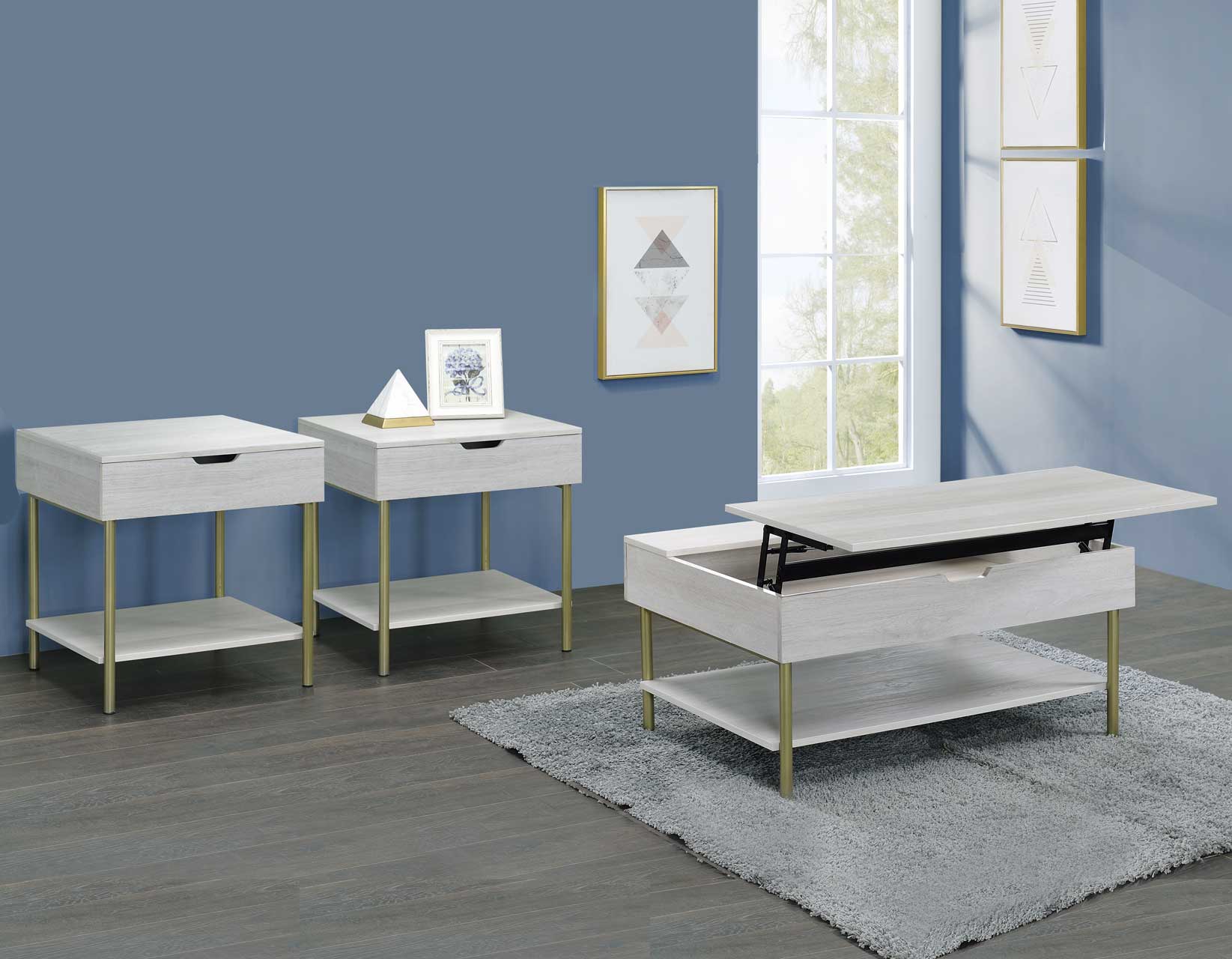 Mid-Century Modern elegance in a Lift-Top Table that offers a great look at a great value! White veneered tops and sides give the look and feel of solid wood accented by champagne finished tubular metal legs for a mixed media style. The Whitman anchors a living room with the convenience of a coffee table, desk or dining table. Beautiful when closed yet very functional when open.
