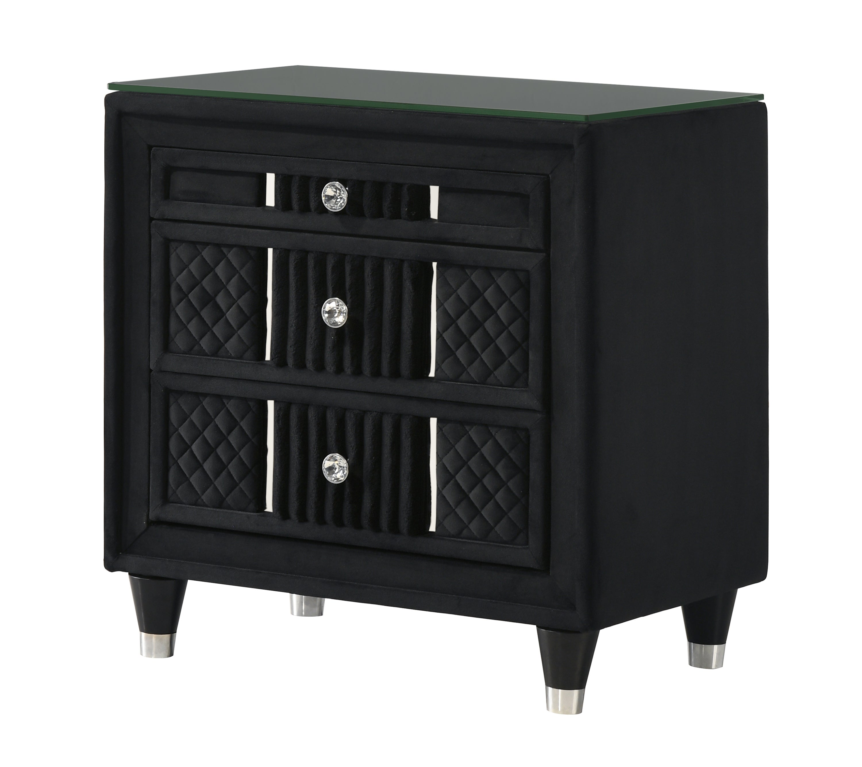 Transform your bedroom into a haven of sophistication and contemporary elegance with the Armany Black Nightstand by Crown Mark. Designed for those who appreciate a blend of modern glamour and everyday functionality, this nightstand elevates the ambiance of any space. Imagine unwinding in a serene, stylish bedroom where bold black velvet and shimmering crystal knobs create an atmosphere of luxury and comfort. The 8mm tempered glass top protects the surface and adds a touch of refinement, while the plush quilted panels and vertical ribbing infuse the piece with visual depth and tactile delight. Perfect for urban apartments, modern homes, or master suites seeking a statement accent, the Armany Black Nightstand brings together aesthetics and practicality in a way that feels both timeless and on-trend. As an ideal companion for designer beds, this nightstand is as functional as it is beautiful, providing ample storage within its three spacious, smooth-gliding drawers. Luna Furniture introduces Armany Black Nightstand to enhance the beauty of your living spaces.