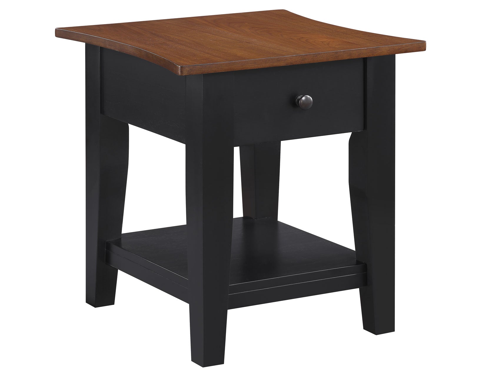The Joplin End Table brings refined style and practical storage to any room. Designed with a rich walnut veneer top and bold ebony-finished solid wood legs, it offers striking contrast and timeless appeal. Gently concave edges at each end add sculptural charm, while a smooth-gliding drawer keeps small items neatly tucked away. A lower shelf provides space for books, baskets, or decorative accents. Whether placed beside a sofa or used as a nightstand, the Joplin End Table delivers versatility, elegance, and smart functionality in a compact footprint.