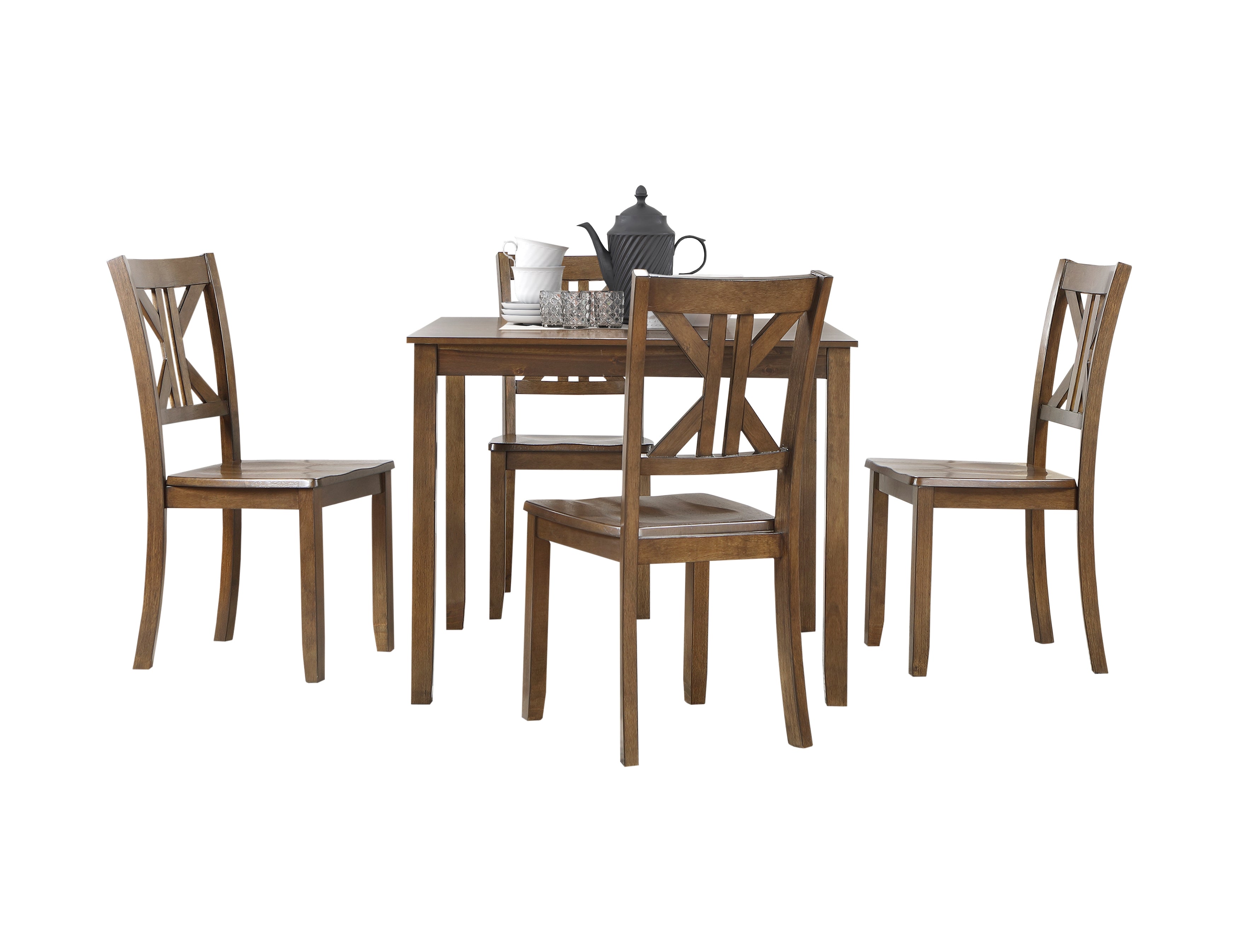 Scaled for your casual dining nook, the transitionally styled Rivera Collection will provide the perfect complement to your home’s decor. Divided X-back wood-framed chairs feature wood seating that pairs with the coordinating table. The five-piece dining collection is offered in a charcoal brown finish over birch veneer.