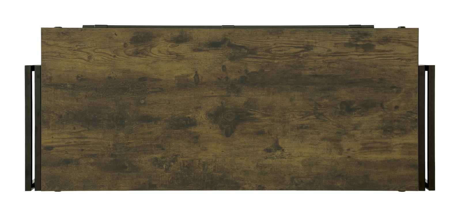 Visually striking, this industrial bar unit transforms modern spaces. With a sleek front, the antique nutmeg finish features an exposed wood grain and distressing that adds texture. A smooth panel in a deep hue matches the open edges of the frame for a cohesive feel. Host guests or play bartender with the one-sided shelves and clean front, complete with a foot rail. Great on its own or with a set of bar stools, this bar unit is perfect for the contemporary entertainer.