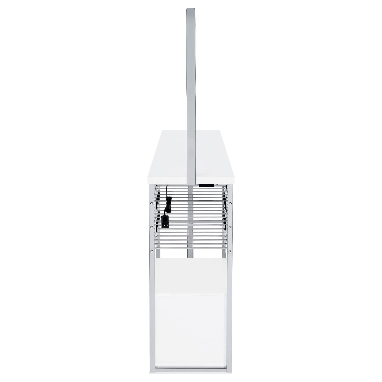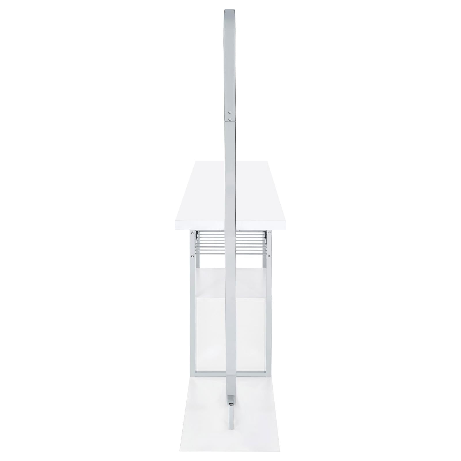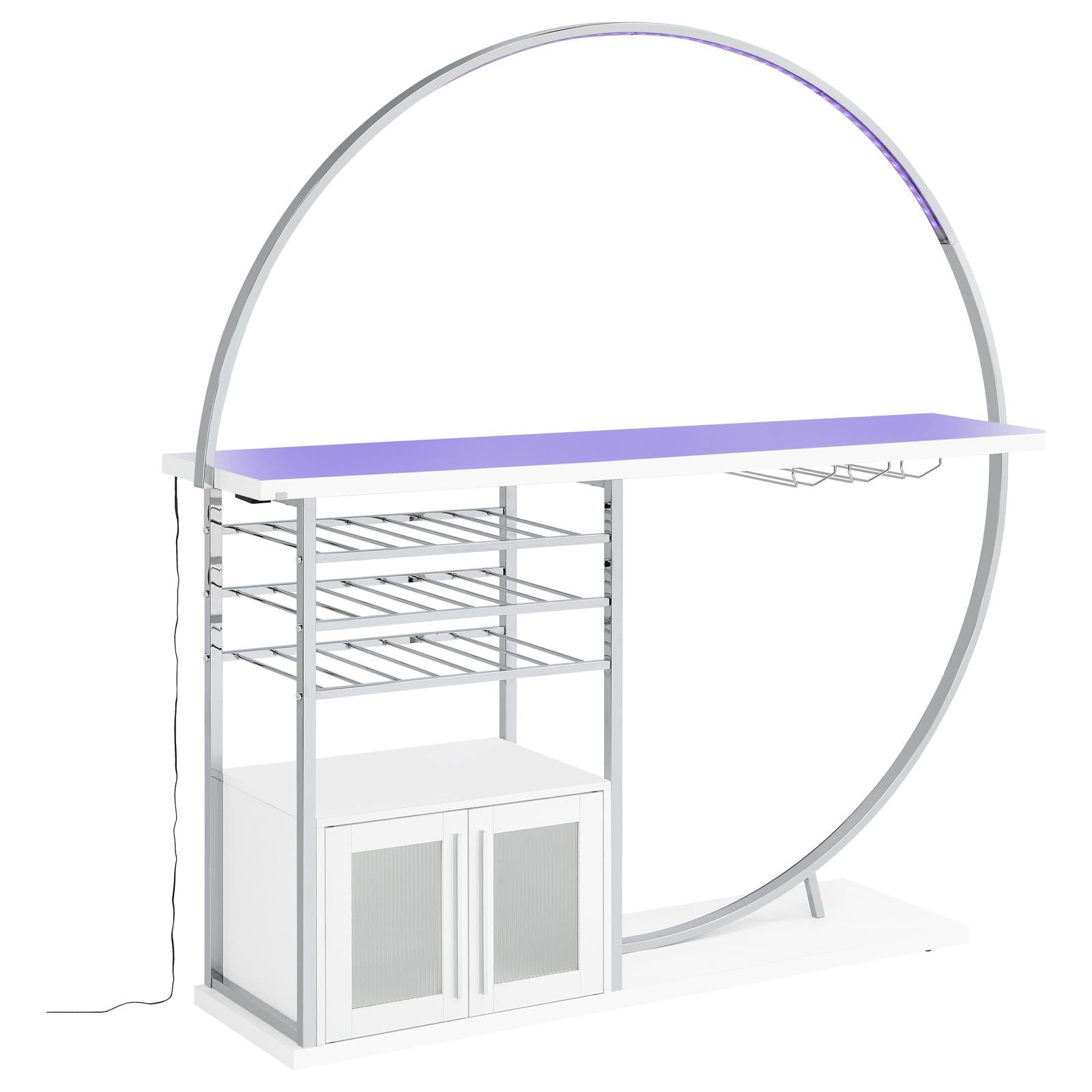Transform your space into a beacon of style with this contemporary home bar that marries function with cutting-edge design. Bathed in the glow of LED lighting with a choice of eight vibrant colors, this piece becomes the centerpiece of any entertainer's haven. The sleek chrome electroplated metal frame supports a durable composite wood tabletop, perfect for hosting an array of glasses and spirits. Below, a two-door cabinet conceals essentials, while three tiers cradle up to 21 bottles of your finest wine. With a built-in stemware rack, this bar doesn't just store your collection, it showcases it, making every occasion a toast-worthy affair.