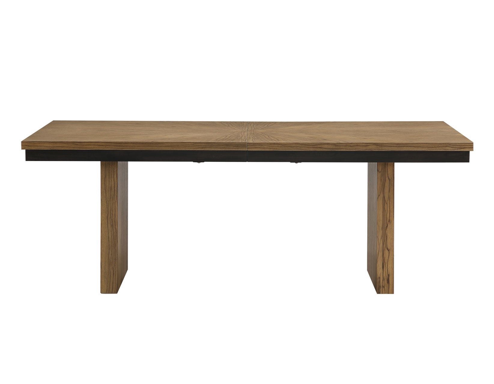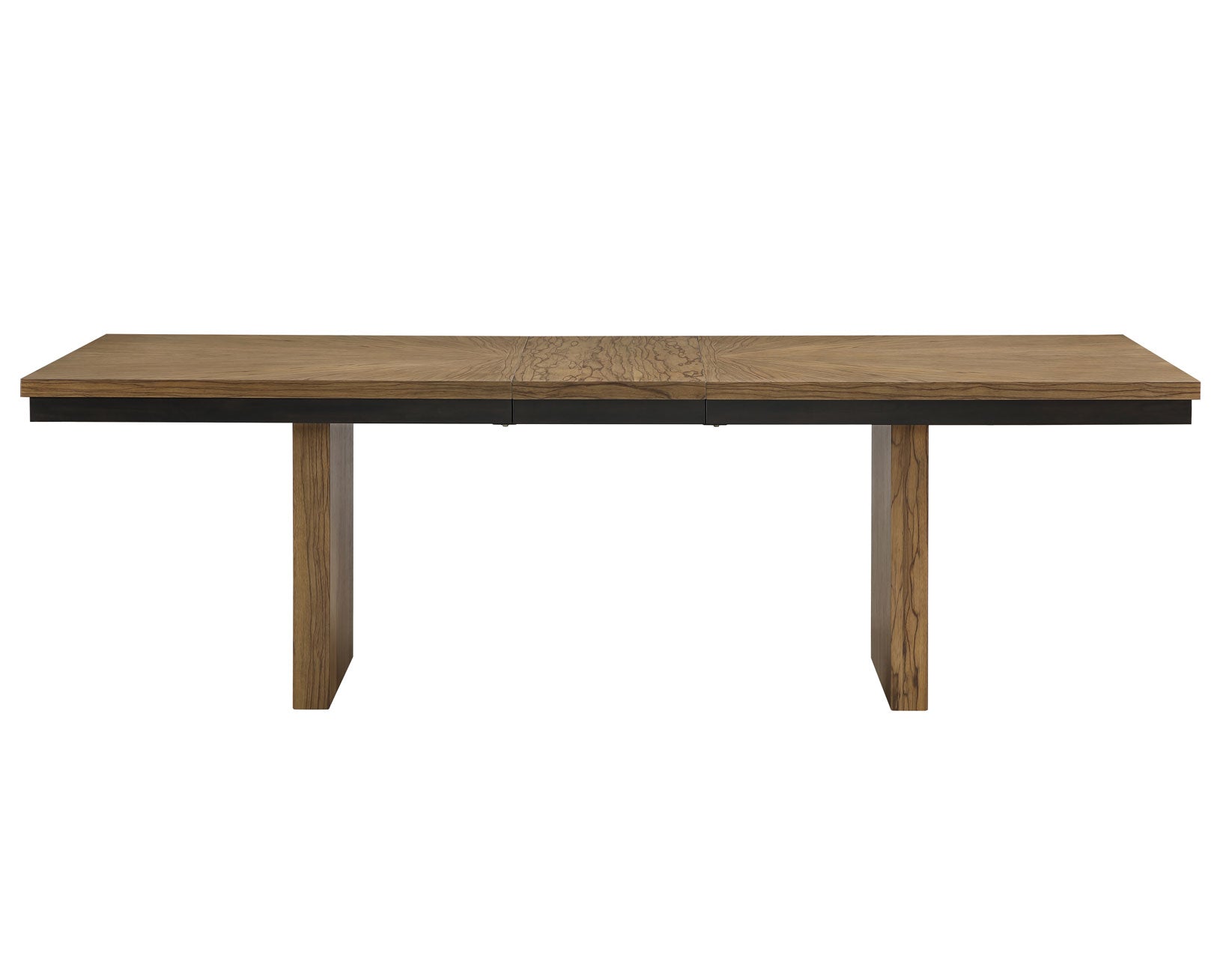 The Roatan 80-96 inch Table with a self-storing 16-inch leaf combines modern design with functionality, making it a standout piece for any dining area. This double pedestal table easily seats ten, offering a perfect solution for both intimate family dinners and large gatherings. Its sturdy base and stylish support enhance the room’s aesthetic while providing reliable durability. The light toffee finish and reverse-matched diamond veneer highlight the natural beauty of the wood, adding warmth and sophistication to your décor. Crafted from limba veneers, solid Asian hardwoods, and engineered woods, this table features a streamlined, elegant look with a two-tone toffee and black finish. The table extends effortlessly with a high-quality steel glide and stores the leaf conveniently underneath. Sorry, your browser doesn't support embedded videos.