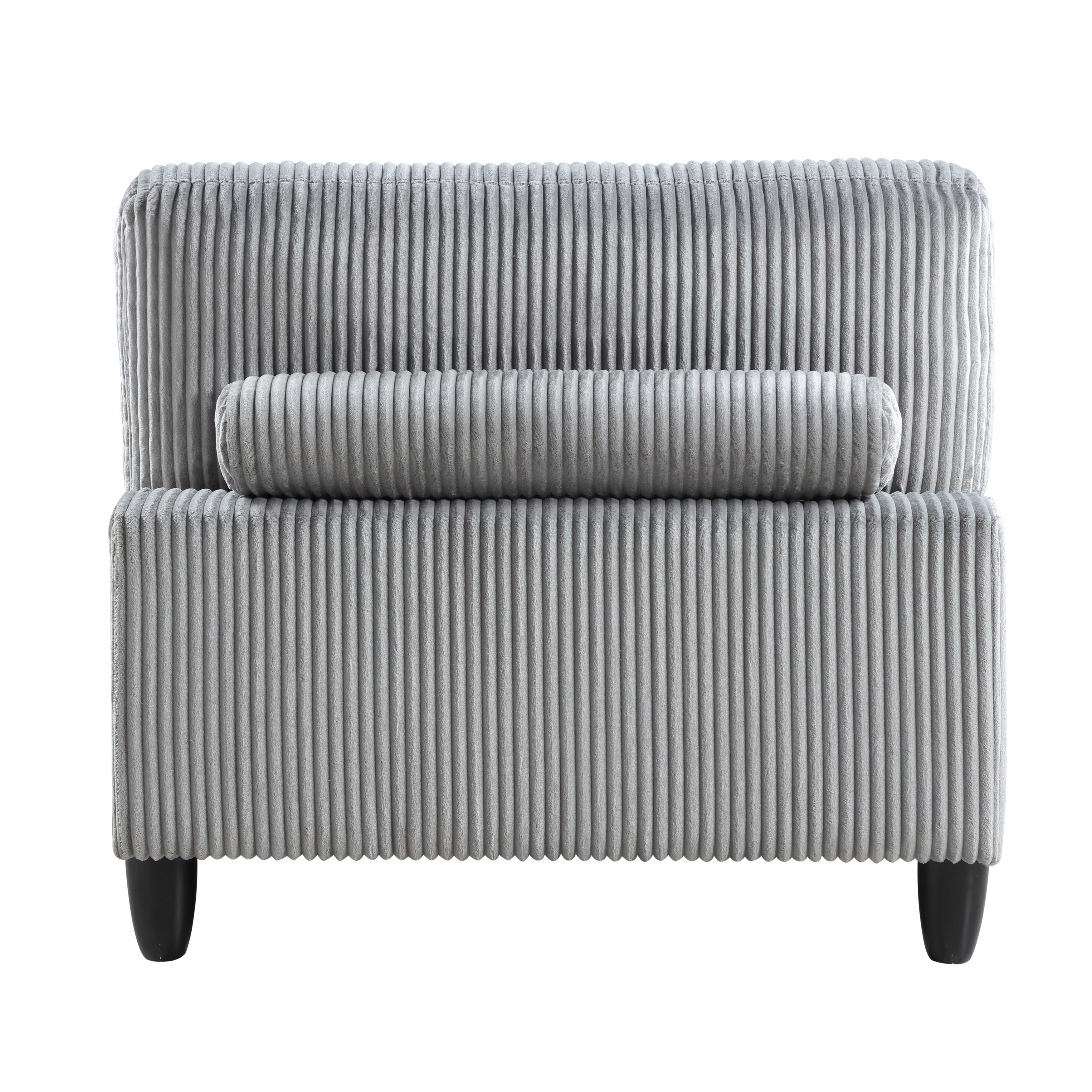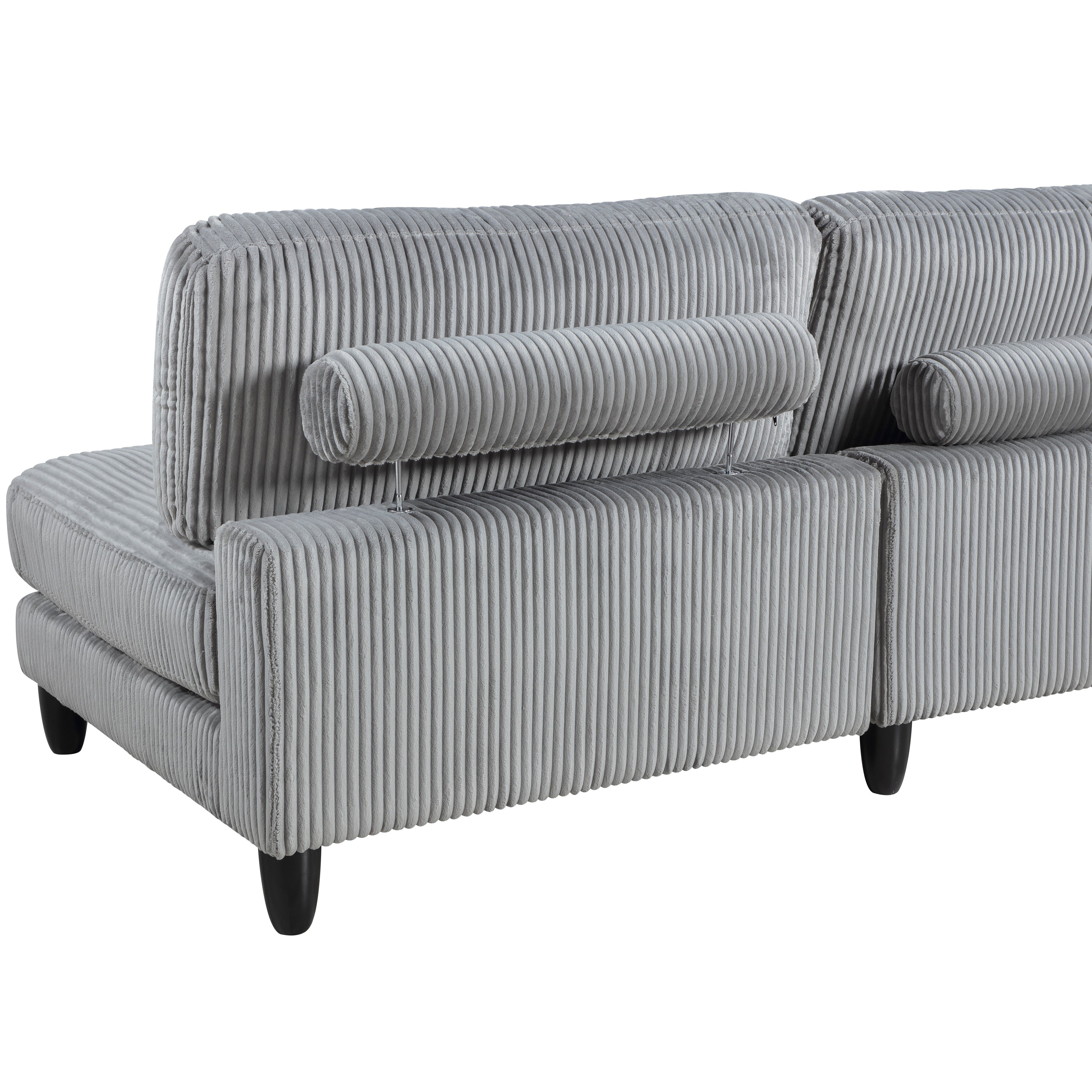 Transform your living room into a luxurious haven with this grand gray corduroy 6-piece modular sectional. Designed for ultimate comfort and versatility, this sectional features foam padding over pocket coils for exceptional support and soft corduroy fabric upholstery for a plush, inviting feel. The unique configuration, including three corner seats and three armless chairs, allows for numerous arrangements to perfectly fit your space and lifestyle, ideal for large families or those who love to entertain. Reversible back and loose seat cushions extend the life of your sectional, while removable cushion covers with zippers simplify cleaning. Nine matching pillows are included for added style and comfort. Solid wood legs in a black finish provide a sturdy and sophisticated foundation. Assembly is required.