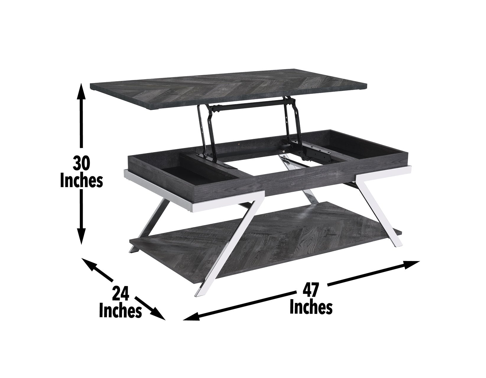 Contemporary style in a shadow grey finish, Roma offers aesthetic and practicality in one package. This mixed media marvel of chrome engineered woods and Silvershield® tops package together beauty with the immense functionality of a Lift-Top Cocktail. Work or dine from your living room couch with a simple lift of the top. The Lift-Top Cocktail Table offers under top storage for devices or remotes and promises to make your life not only easier but more stylish as well.