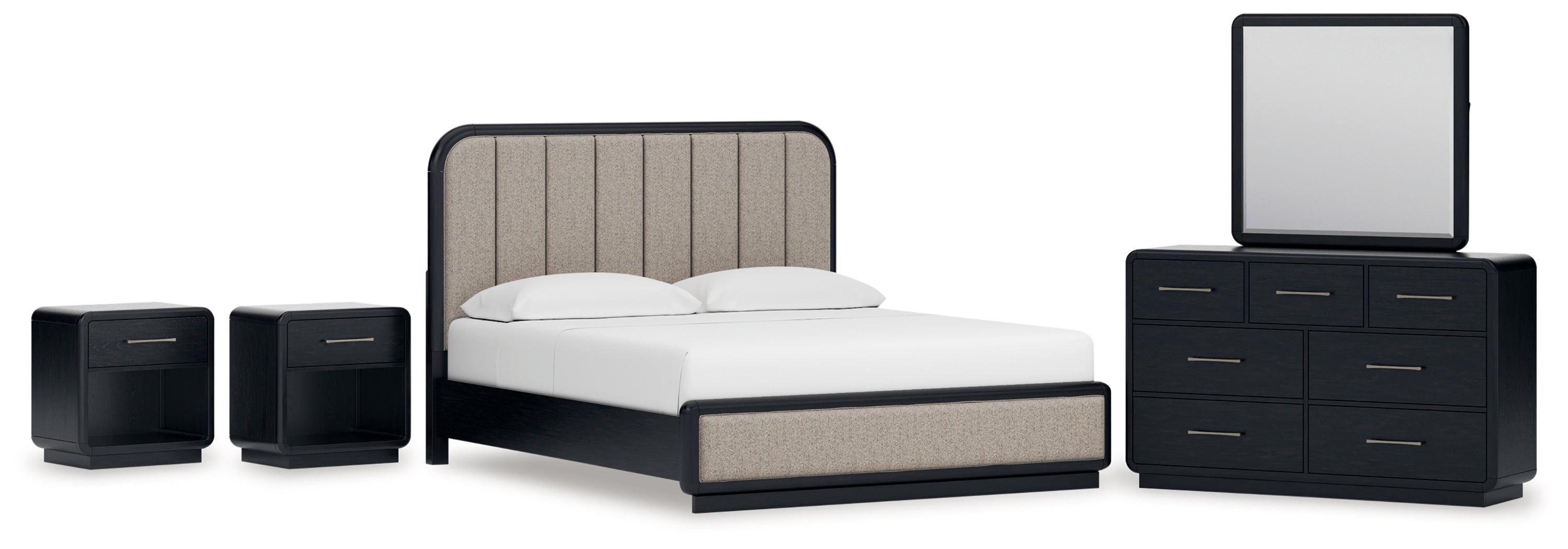 Rowanbeck California King Upholstered Panel Bed with Mirrored Dresser and 2 Nightstands in Gray/Black