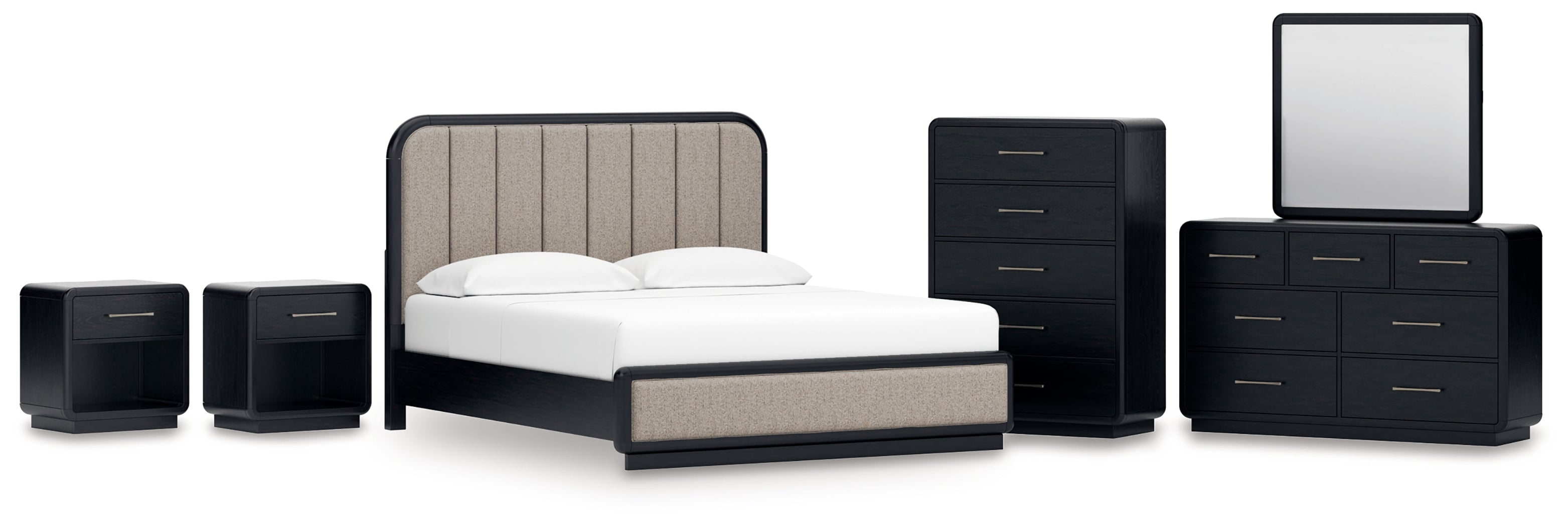 Rowanbeck California King Upholstered Panel Bed with Mirrored Dresser, Chest and 2 Nightstands in Gray/Black
