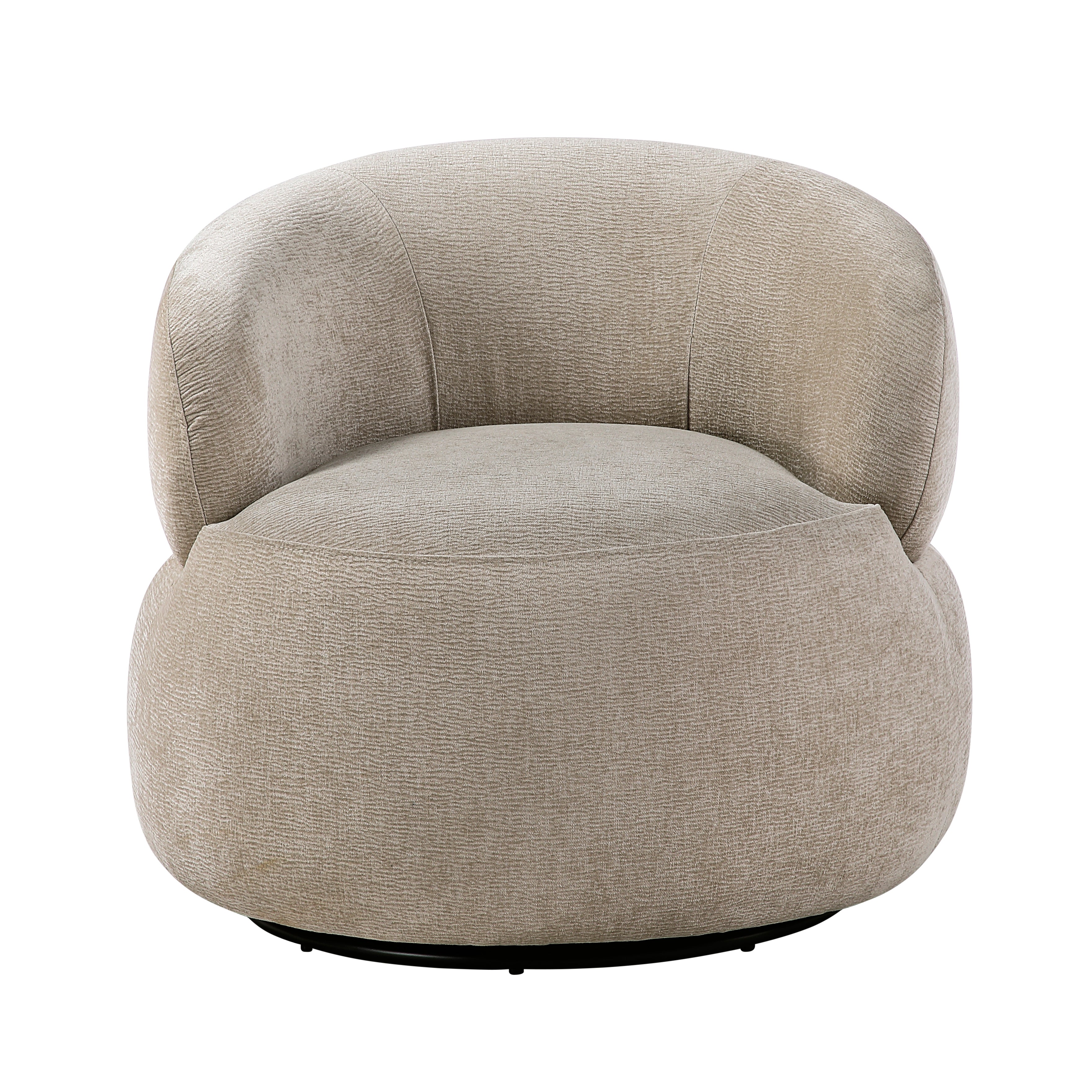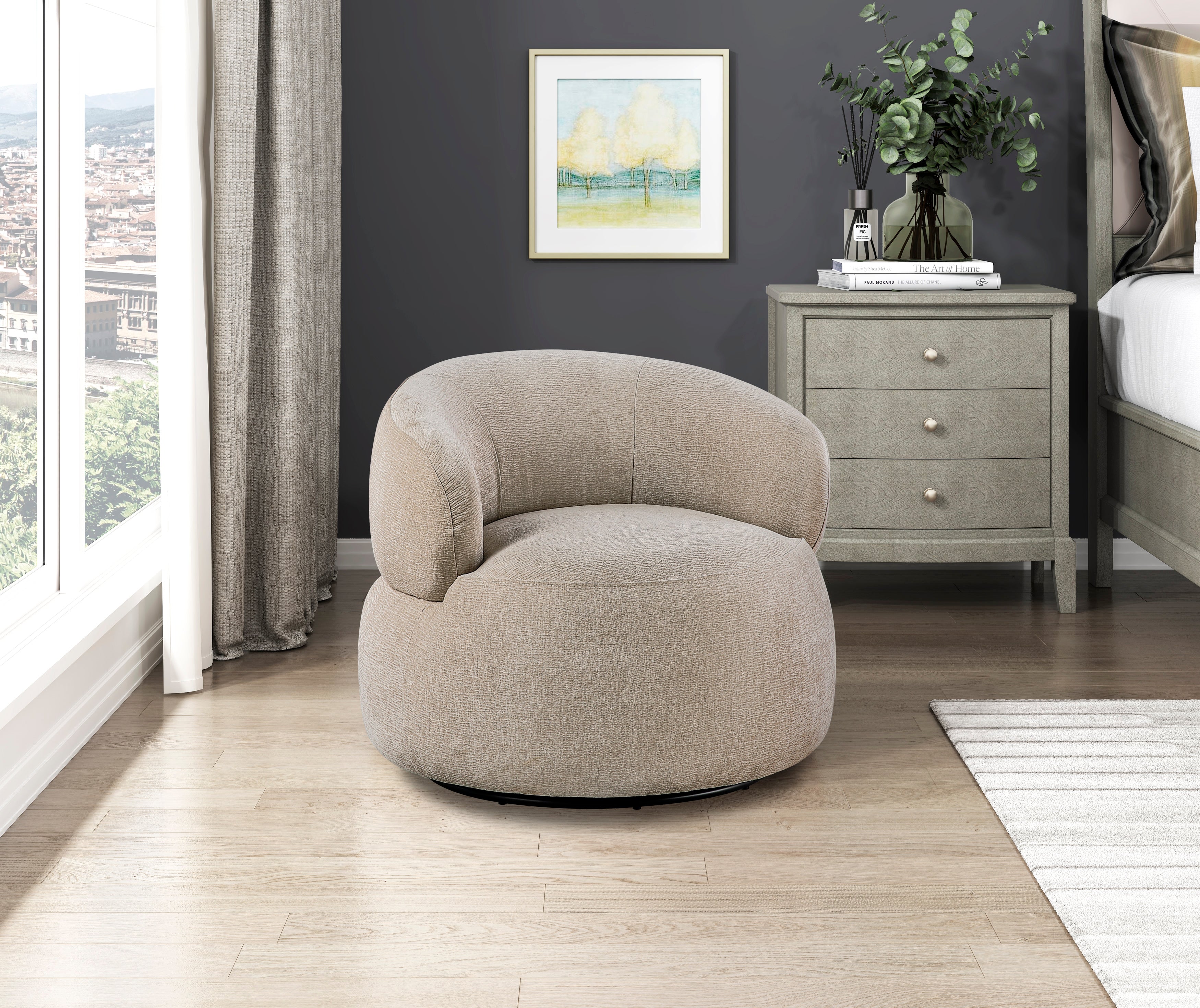 Add a touch of modern luxury and cozy comfort to your living room, bedroom, or reading nook with this stunning light brown swivel accent chair. Upholstered in rich, textured chenille fabric, this barrel-style seat features a plush foam cushion and a rounded silhouette that invites you to sink in and relax. Built on a robust solid wood and plywood frame with a discreet metal base, it offers a smooth 360-degree rotation, allowing you to easily engage with conversation or view the television from any angle. With its vibrant color and chic design, this chair serves as both a comfortable seat and a sophisticated statement piece that arrives fully assembled and ready to enjoy.