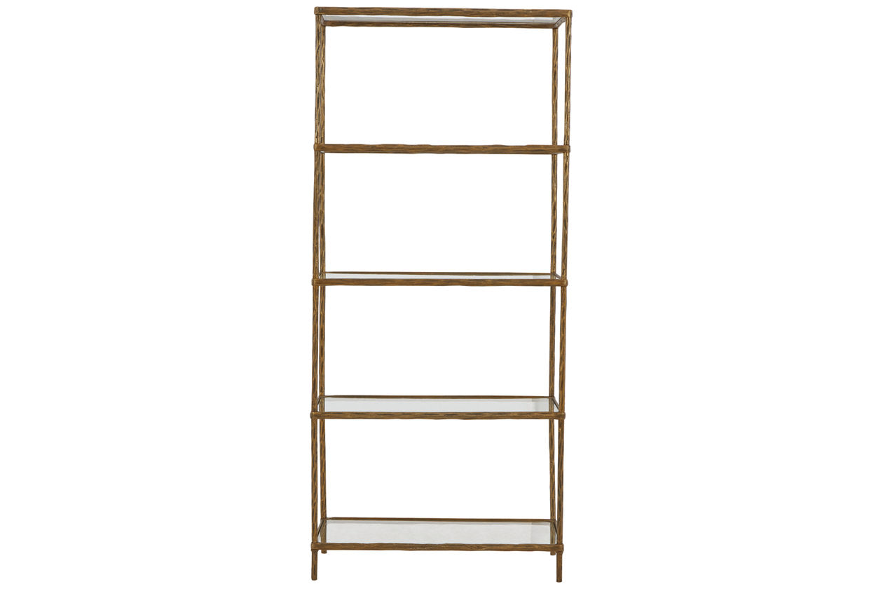 Classic in design with a dash of textural appeal, this bookcase provides endless possibilities for displaying your decor. Five shelves offer the perfect perch for potted plants, books or your favorite framed artwork. The frame's antiqued brass-tone finish has a rustically luxe look that remains versatile, suiting spaces from casual to contemporary. — Luna Furniture introduces Ryandale Bookcase to enhance the beauty of your living spaces.