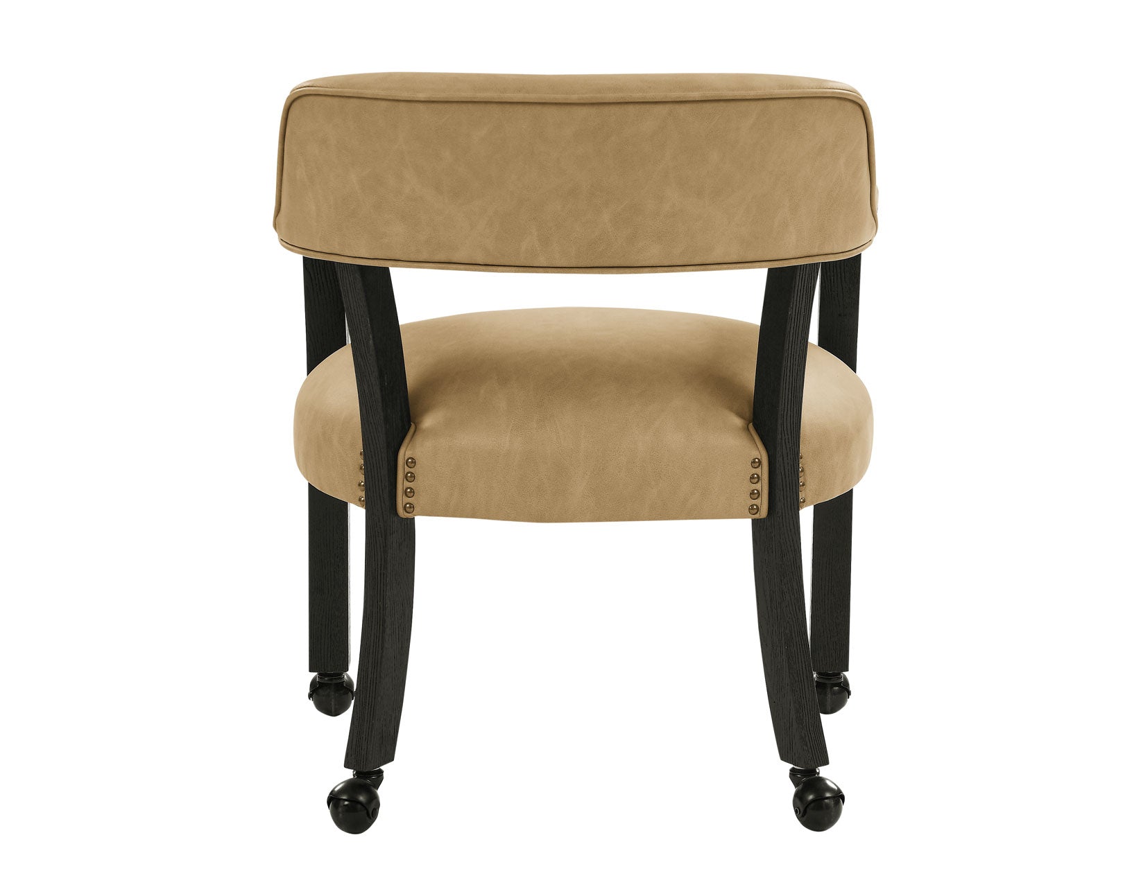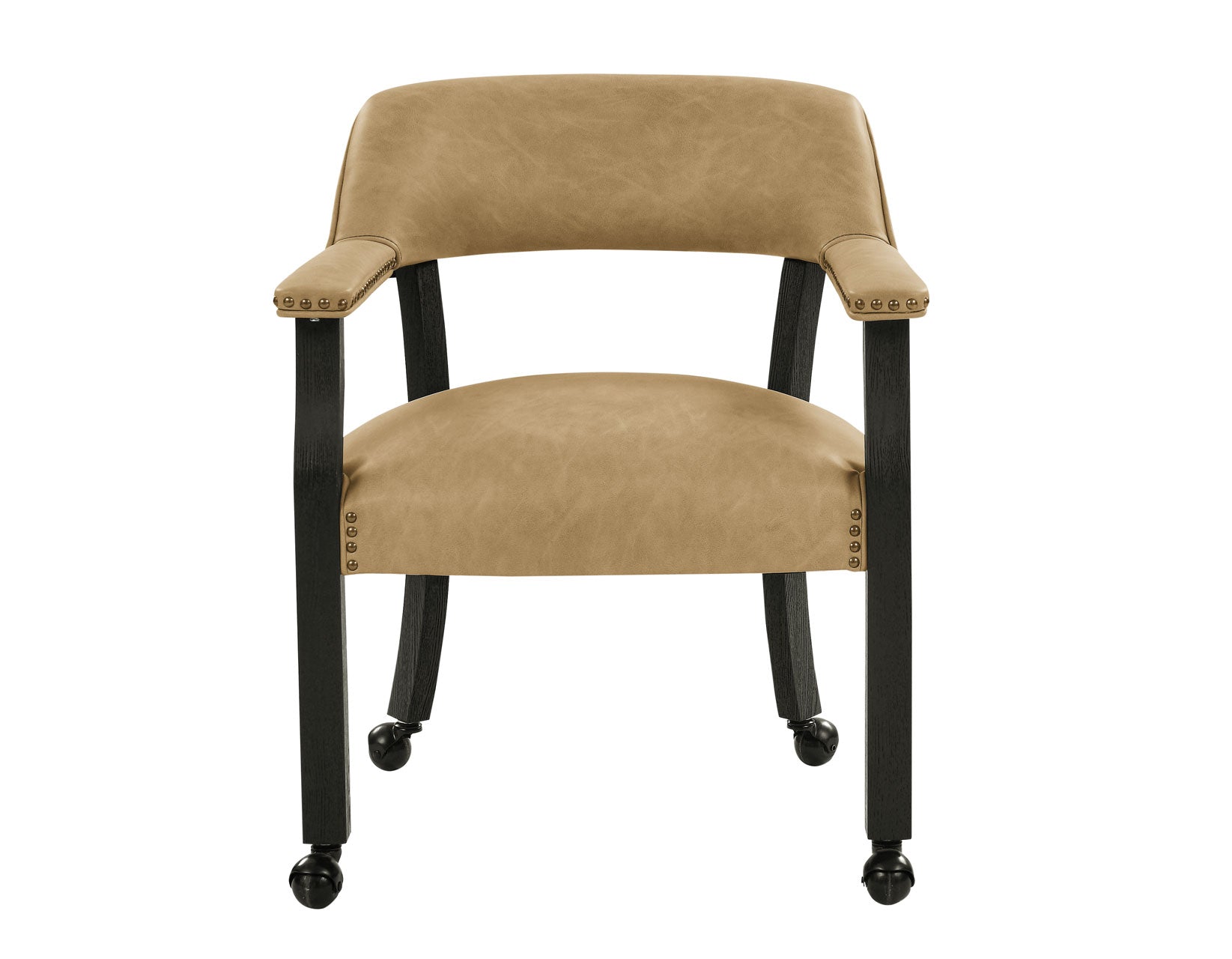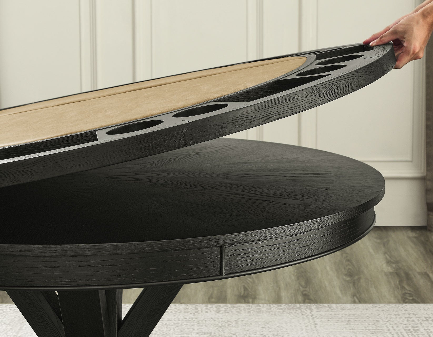Get ready for game night with the Rylie Black Finish 6-Piece Game Dining Set! This set includes a 48-inch round table with a folding game top and four comfy castered Captain’s chairs in sand vegan leather, jazzed up with copper nailhead trim. The folding game top offers eight stations with dual cupholders and chip holders. When the games are done, remove the top, tuck it away in its carry case, and you’ve got a sleek dining table ready for four. The glossy black finish gives it a modern edge, perfect for any room. Each piece is crafted from oak veneers, poplar, and Asian hardwoods, kiln-dried to avoid warping or mildew. The pinwheel oak veneer pattern on the table adds elegance, making it great for dining or working. The chairs, with full rotation and solid wood legs, are stylish and practical.