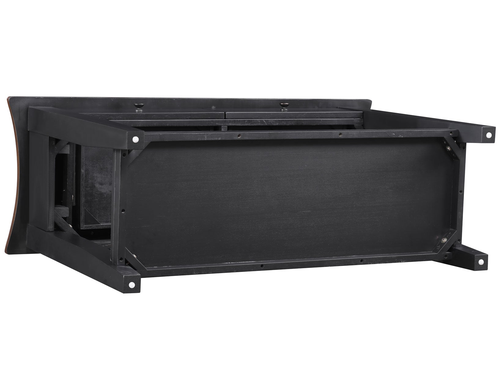 The Joplin Sofa Table blends modern function with classic design for a versatile accent piece. Featuring a rich walnut veneer top and bold ebony-finished solid wood legs, it offers striking contrast and timeless appeal. Subtle concave edges at each end add sculptural interest, while two smooth-gliding drawers provide convenient storage for everyday essentials. A lower shelf offers additional space for display or organization. Perfect behind a sofa, in an entryway, or as a compact entertainment center, Joplin brings style and smart utility to any living space.