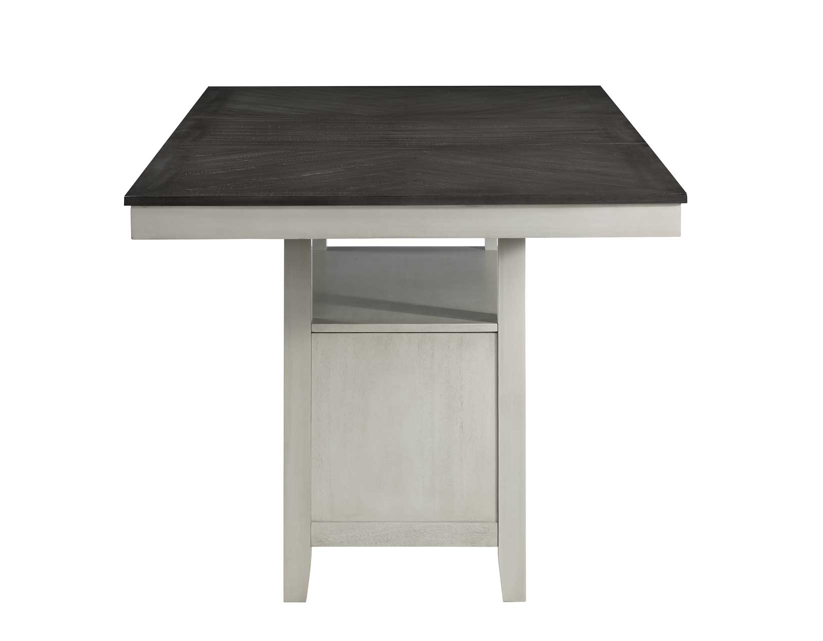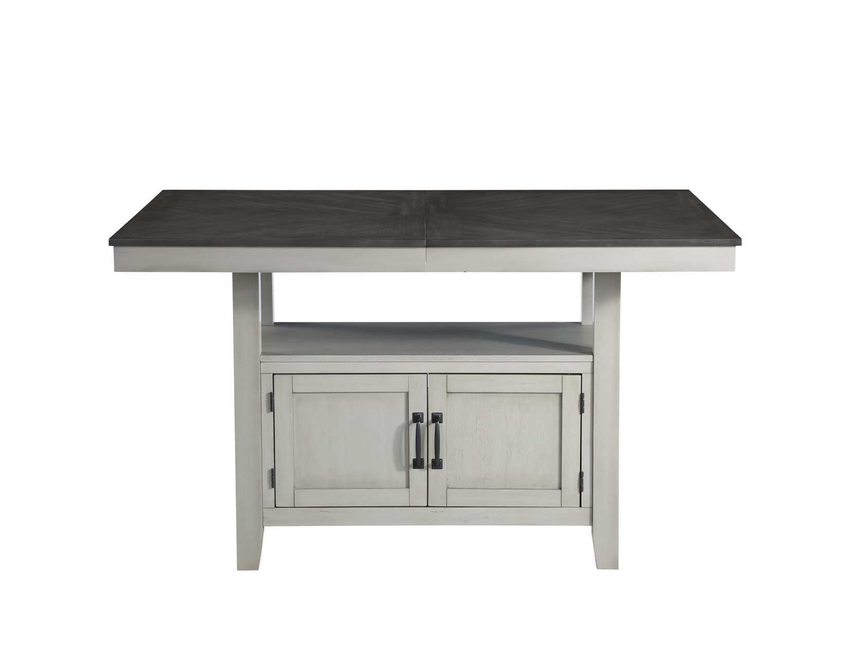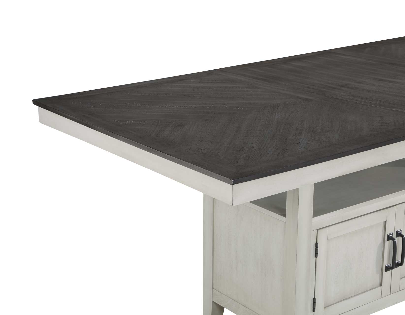 Counter-height table in a fashion-forward dove gray and smoky oak two-tone finish. Oil-rubbed nickel hardware completes the neutral transitional look that features relaxed styling that can be dressed up or down. The Counter Table features two doors in the base for hidden storage and a shelf for storage or display. The 20-inch leaf extends the table to a full 80-inches for seating up to eight.