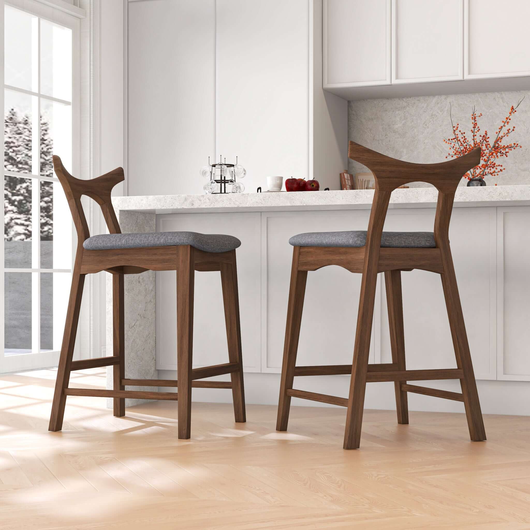 The Mid-Century Modern solid wood set of 2 bar/counter chairs is a stylish and functional addition to any contemporary home or commercial space. Crafted with high-quality solid wood, these chairs are built to last and provide a sturdy seating option. The sleek black PU upholstery adds a touch of sophistication and elegance to the chairs, making them suitable for both formal and casual settings. The black color also allows for easy integration into any existing interior design scheme. The chairs are comfortable and ergonomic, with a curved backrest and cushioned seat. This ensures optimal comfort and support, making them perfect for extended periods of sitting. The footrests provide additional comfort and stability, allowing you to relax and enjoy your time at the bar or kitchen counter. With their Mid-Century Modern design, these chairs exude a timeless appeal that never goes out of style. The clean lines, tapered legs, and minimalist aesthetic make them versatile enough to complement various decor styles, from retro to contemporary. In addition to their aesthetic appeal, these bar chairs are also highly functional. They are the ideal height for bar counters or kitchen islands, allowing you to comfortably sit and socialize while enjoying a meal or a drink. The solid wood construction ensures durability and longevity, making them a worthwhile investment. Whether you want to upgrade your home bar or add a touch of sophistication to your kitchen, the Mid-Century Modern solid wood set of 2 bar chairs is a perfect choice. With their combination of style, comfort, and durability, they are sure to enhance any space and provide a chic seating option for years to come.