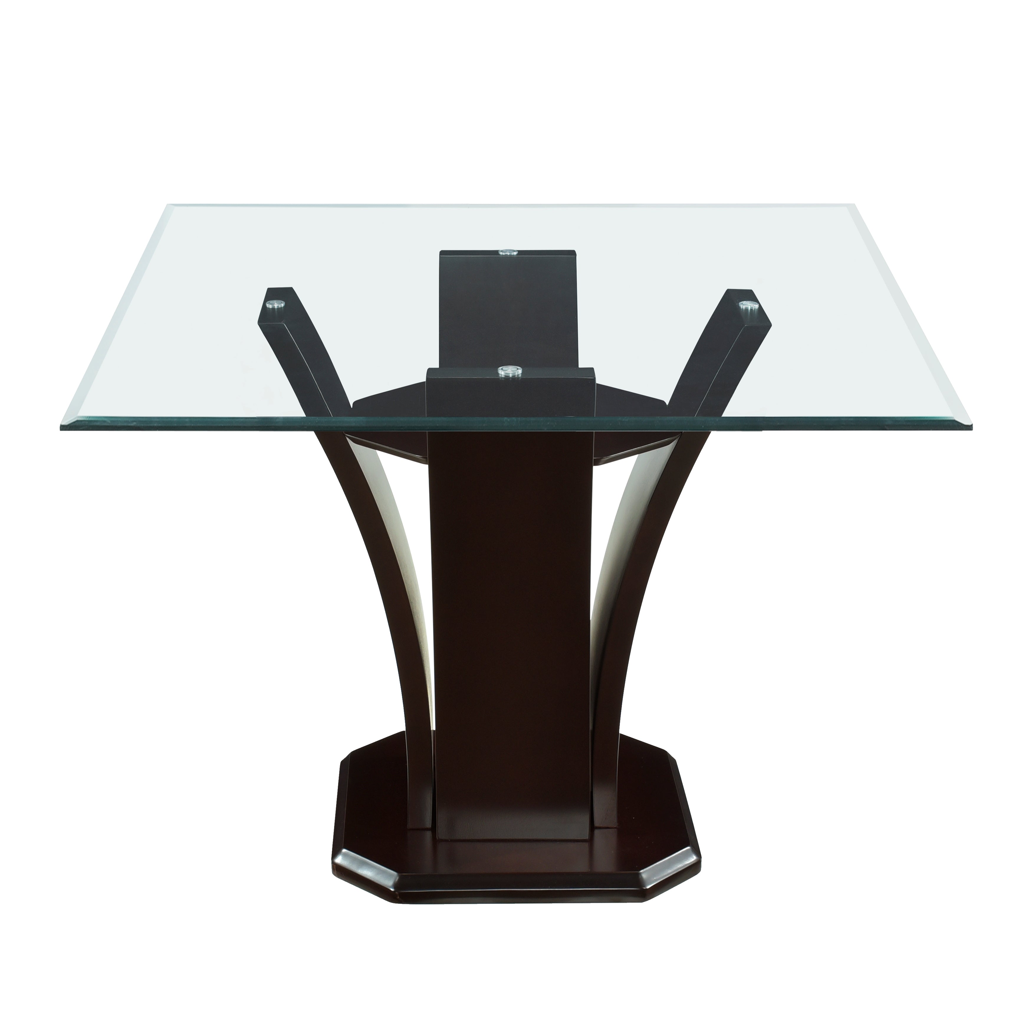 Daisy Collection combines superb visual appearance and fine quality that you need in your dining area. Three distinct elegant flared tulip bases support beveled glass tabletops on the square counter height table. The table is constructed of hardwood solids and veneers in a refreshing espresso finish.