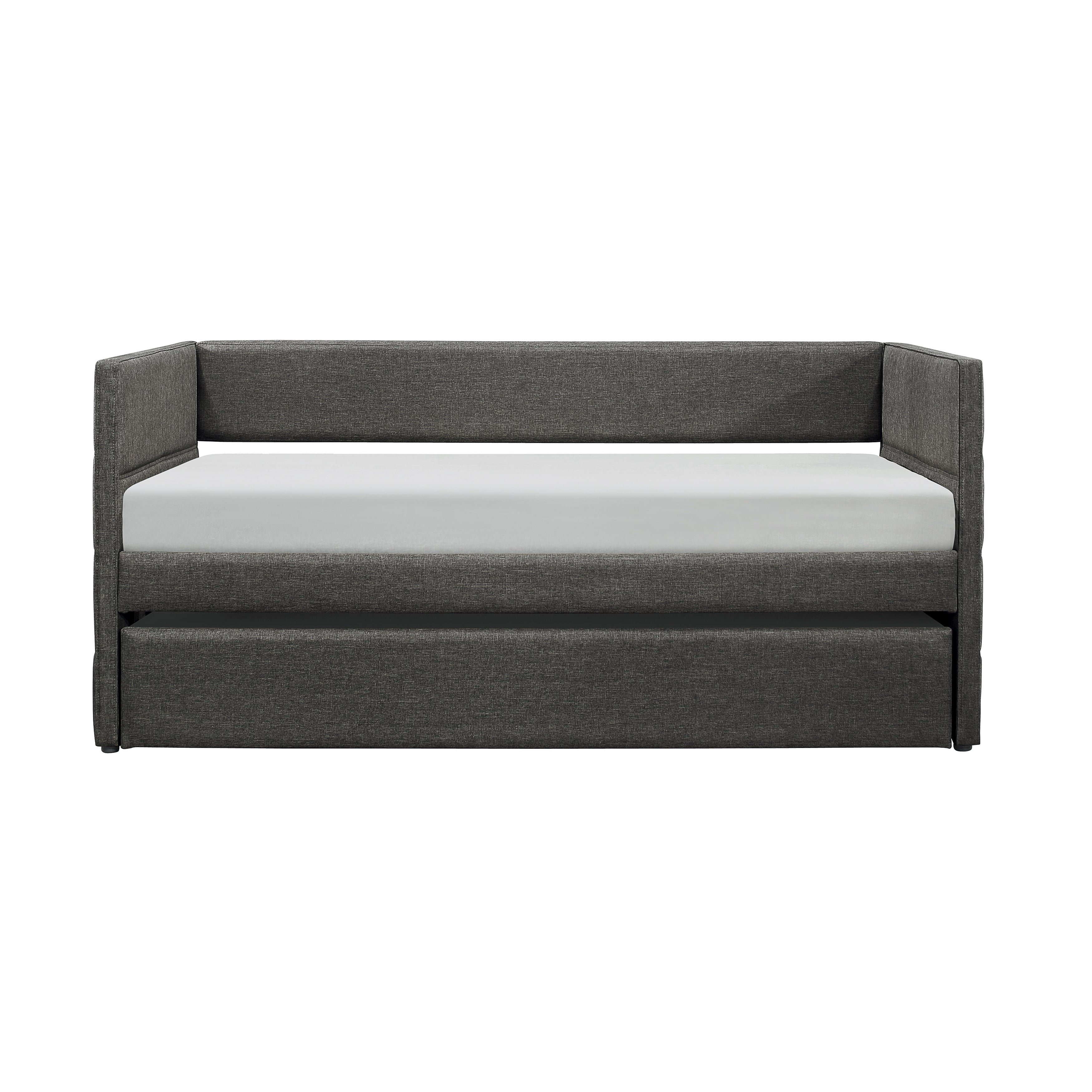 As a departure from the expected size of a twin bed, the Vining Collection provides an ample amount of sleep space within a defined area. From transitional to contemporary, the unfettered design of the daybed allows for placement in a number of home environments. The daybed is upholstered in a dark gray fabric, furthering the stylistic versatility. A twin size under-bed trundle pulls out to accommodate your additional sleep space needs.
