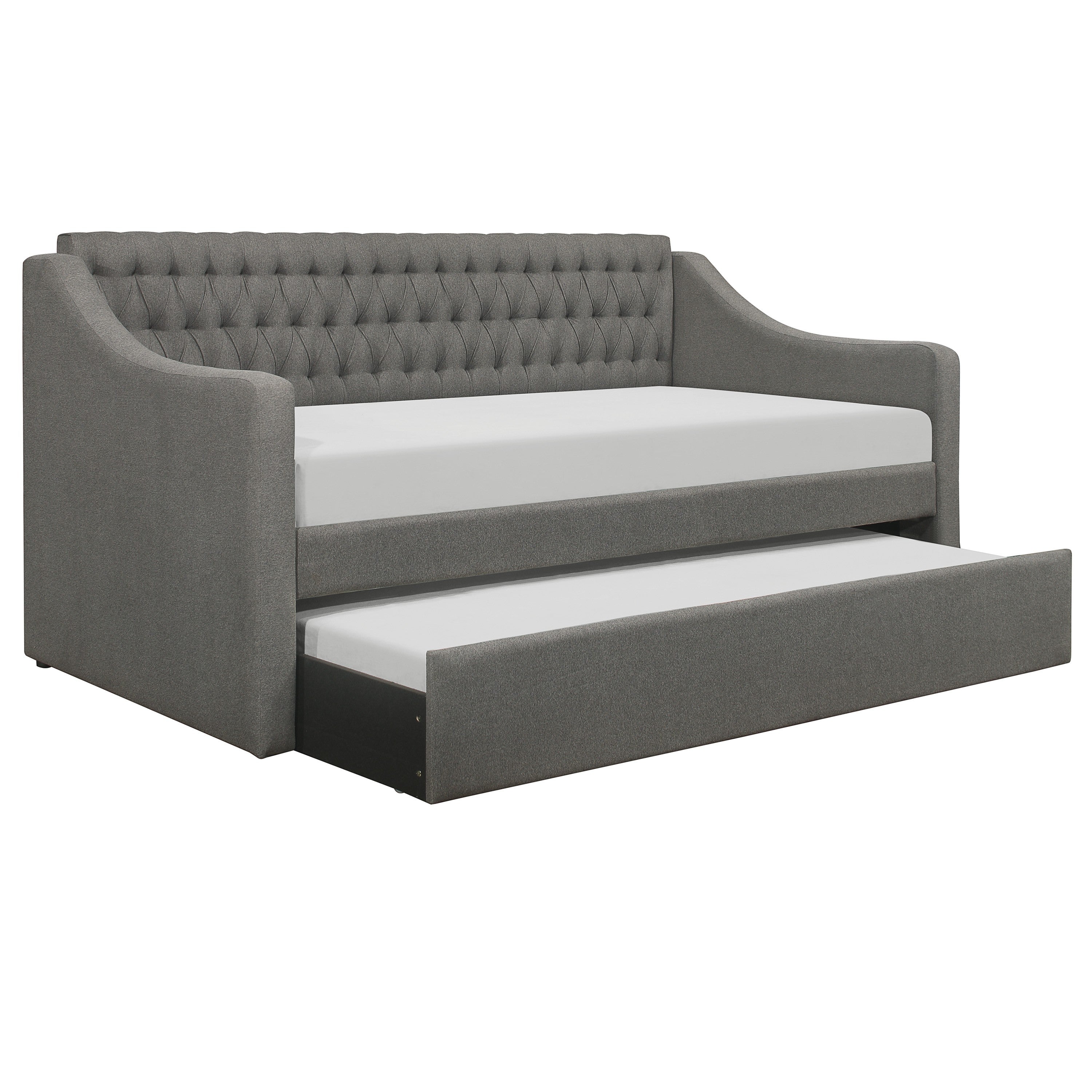 Modern traditional styling blends classic accent and clean lines to create the look of the LaBelle Collection features button tufted dark gray flannel fabric. Additional sleep space comes in the form of an under-bed pull-out trundle.