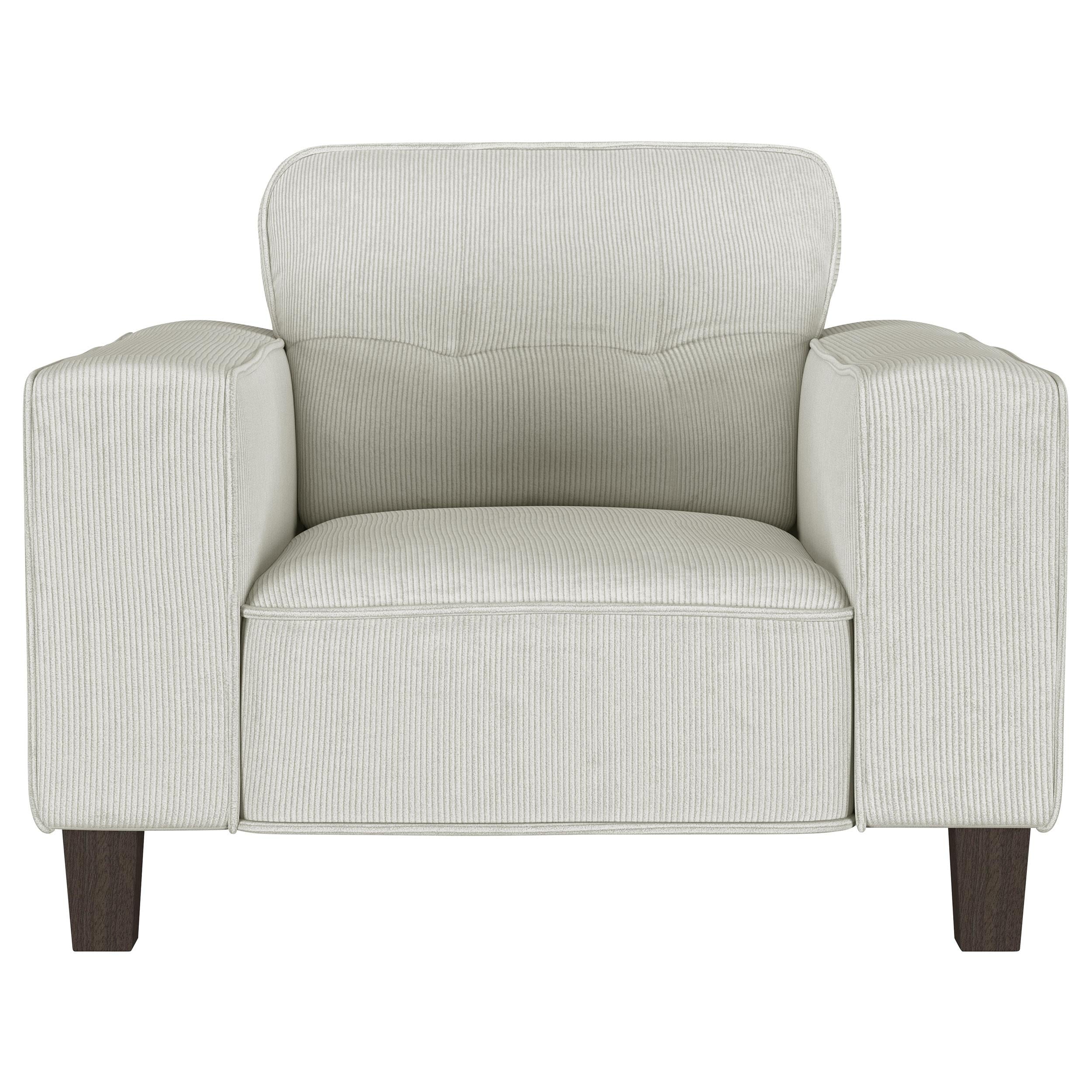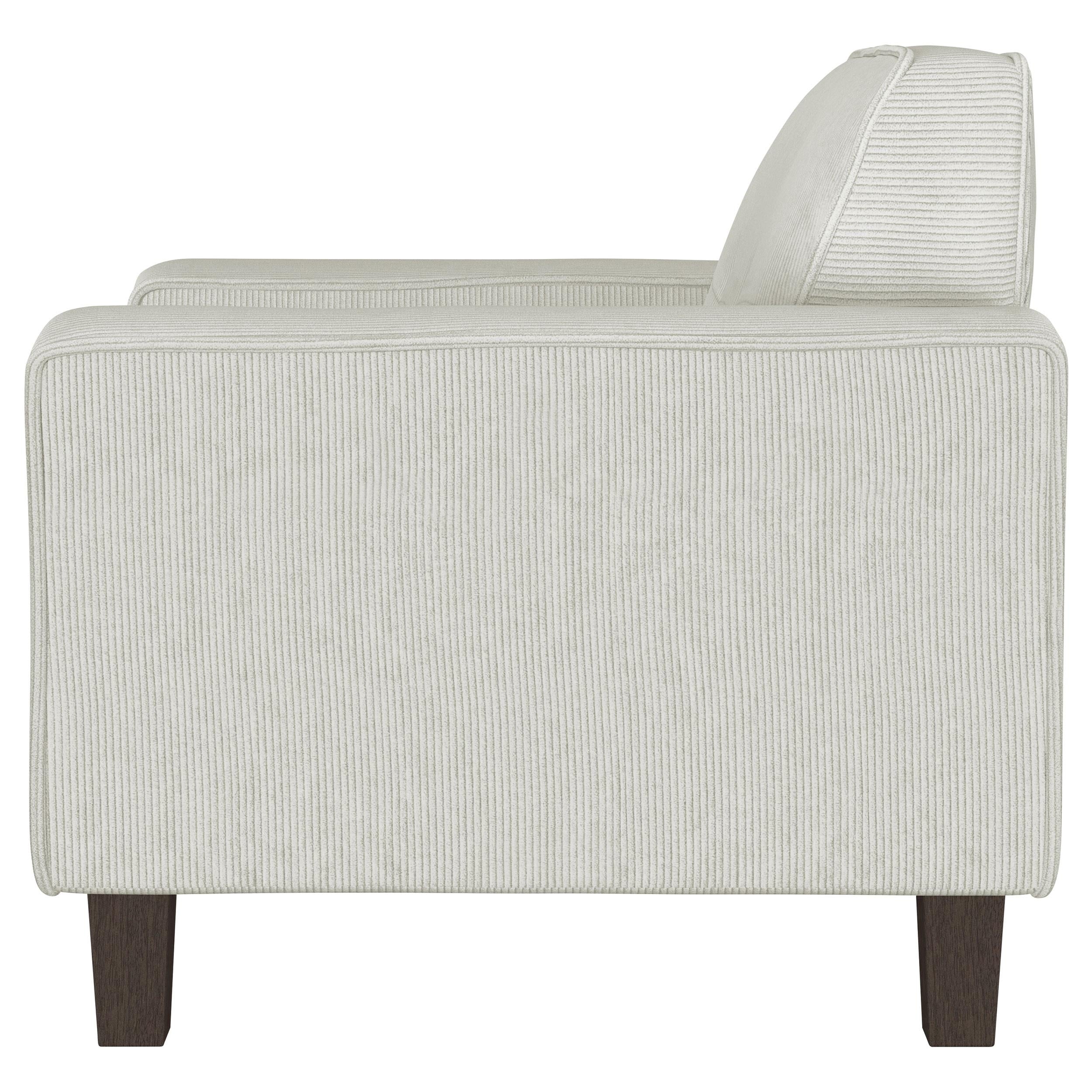 Create a lush, comfortable seating group with a modern accent armchair. Designed for indulgent comfort, it features a solid stance complete with wide track arms and plush cushions. Its soft upholstery is appealingly neutral, complementing in any setting with corduroy like texture that adds chic dimensionality. Back cushions are tufted, with a grid pattern that adds stylish character perfect for a relaxed and inviting living space. The look is complete with tall, tapering wood legs that create a touch of lift for an airy finish.