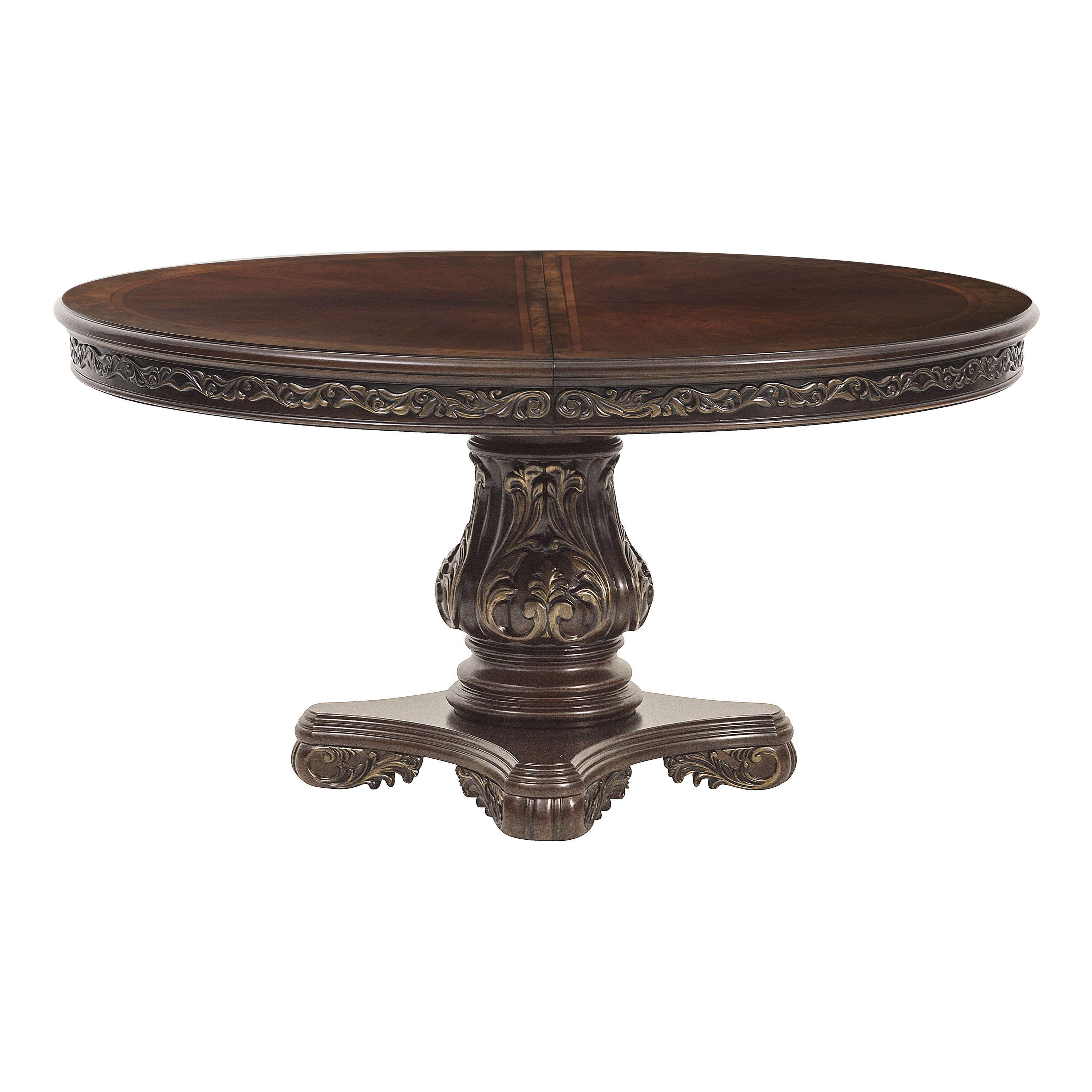 Walking into the dining room that is occupied by the Deryn Park Collection will immediately invoke your love of the traditional aesthetic. Stately from every angle, sophisticated design elements blend to create this beautiful collection. Burl inset flanks the book-match veneered cherry-finished tabletop. With two table options – the rectangular double pedestal base, and the oval topped single pedestal – the collection allows you the flexibility to fit the scale of your dining room. Each chair features an elaborately designed back and a richly hued fabric cover. The china and coordinating server provide ample display and storage space for your tabletop accessories. The cherry finish is highlighted by gold tipping that accentuates the traditional feel of elegant Deryn Park Collection.