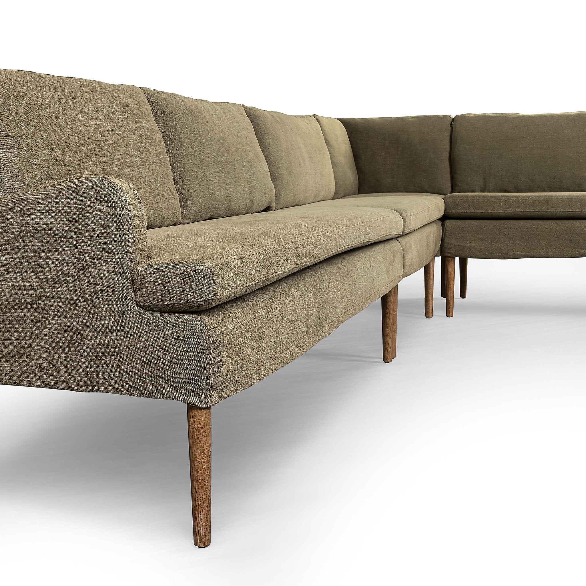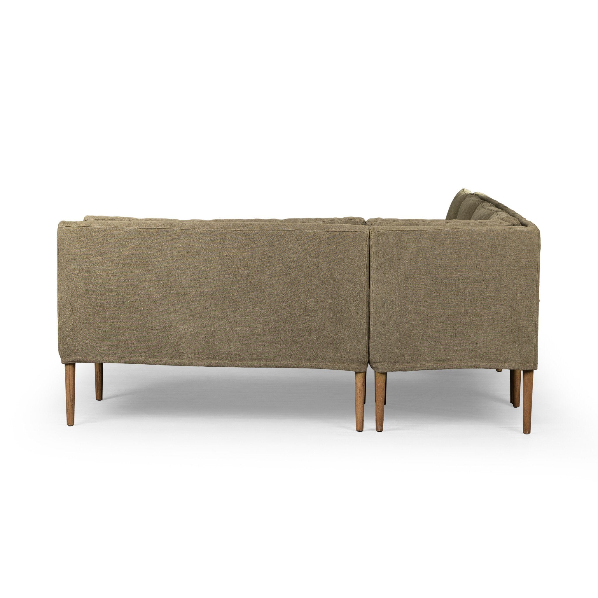 Heritage-inspired comfort. Sloping track arms are a study in playful forms, while the banquette frame's fluid shape creates a simple, polished look. Tapered legs extend beyond a short skirt for a more relaxed style. Covered in 100% linen. A design collaboration by Amber Lewis and Four Hands. This item has limited online distribution and may not be sold on websites without prior approval. Visit the FAQ page in our Help Center for more details. — Luna Furniture introduces Aurelia Dining Banquette L-Shape in Broadway Olive to enhance the beauty of your living spaces.