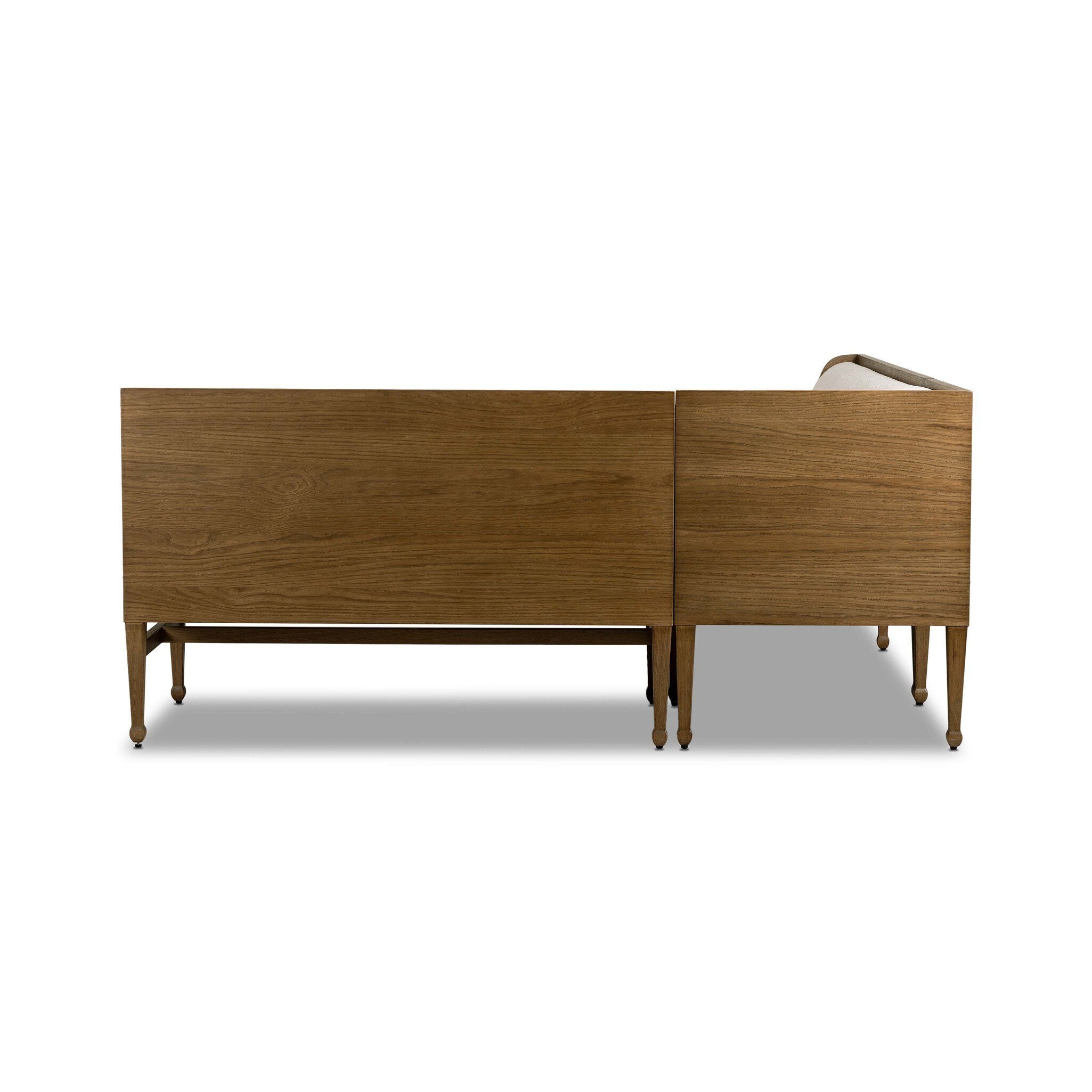 Create your own corner for dining and conversation with this modular banquette, crafted from warm oak. Thick cushioning supports the seat and back, upholstered in snow-white Crypton® performance fabric. Crypton® performance fabric is specially engineered for protection against stains, moisture and odor. Tall, tapered square legs have bun feet for a traditional finish. — Luna Furniture introduces Priscilla Dining Banquette L Shape in Crypton Wayfarer Snow to enhance the beauty of your living spaces.
