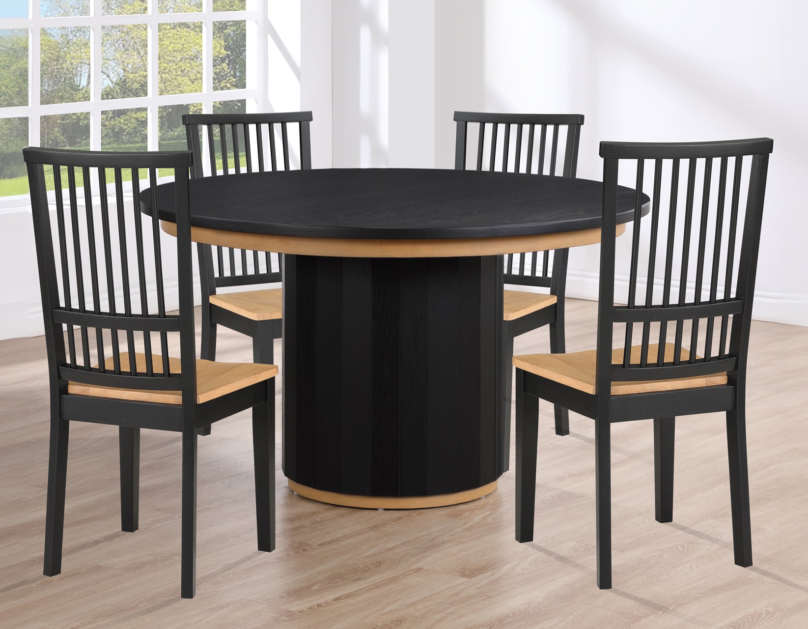 Sophistication meets modern comfort in the Magnolia Black Round Dining Room Set. The focal point is the table, showcasing a lustrous black finish and exquisite gold band accents. Clean lines define the contemporary look, complemented by the two-tone black and naturally finished chairs with gracefully shaped wooden seats. This set effortlessly bridges the gap between upscale elegance and casual comfort, creating a modern dining ensemble that is both inviting and refined. Elevate your dining experience with the Magnolia set—an embodiment of style that strikes the perfect balance between chic and relaxed living. Explore more sophisticated dining options at Luna Furniture.