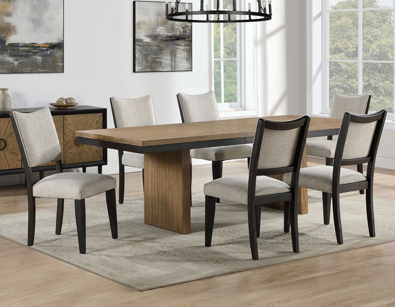 The first thing you notice with the Roatan Toffee/Black 80-96 inch Dining Room Set is the top, featuring a reverse-matched diamond veneer inlay. The beauty of the limba wood creates a stunning palette for table settings, making it the centerpiece of your dining room. At 80 inches, the table effortlessly expands to 96 inches on a smooth ball-bearing glide, comfortably seating up to ten. The leaf conveniently stores within the table mechanism, saving valuable storage space. The cushioned 5-inch seats are both elegant and comfortable, upholstered in a light gray oatmeal fabric with a subtle herringbone pattern that adds a touch of sophistication without overpowering your décor. The modern black and toffee finish highlights the natural beauty of the limba wood, ensuring you’ll love this set for years to come. Explore more exquisite furniture for your home at Luna Furniture.