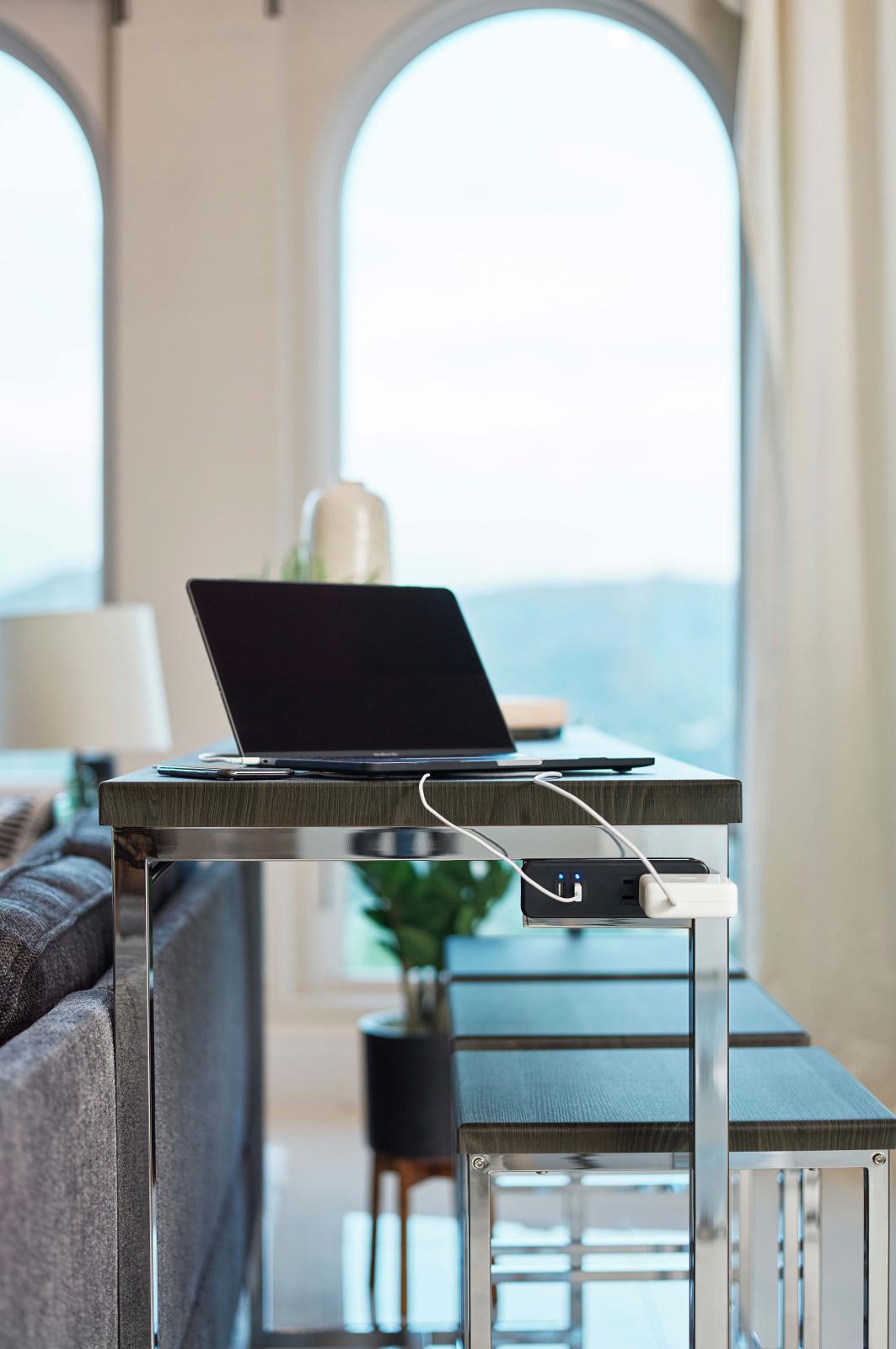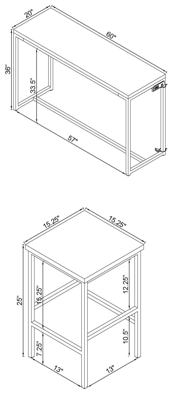 Update any living space with the rich, modern design of this four-piece, counter height table set. Complete with one table and four stools, this versatile set creates a stylish gathering space in any room. The rectangular table features a scratch-resistant surface in a warm, dark oak finish. A built-in power outlet keeps digital devices close by as you enjoy casual conversation with guests. Three counter height stools are also included, each exquisitely crafted with sleek, metal frames in a high-shine chrome finish.