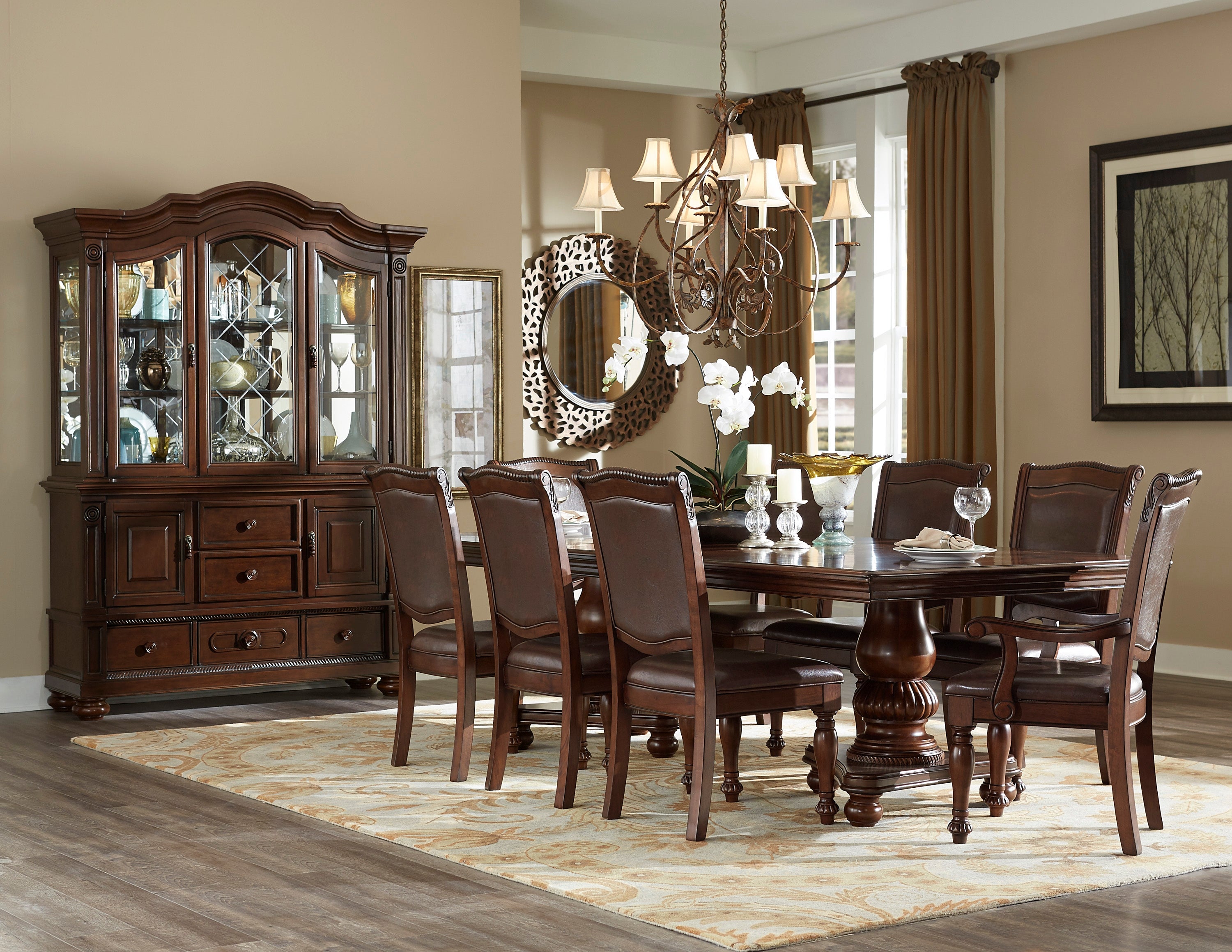 Elegantly designed for the traditional dining room is the Lordsburg Collection. Supported by the double pedestal base is the tabletop where the magnificent parquet veneer is highlighted by the brown cherry finish. Heavily carved molding provides distinct accent to the tabletop.