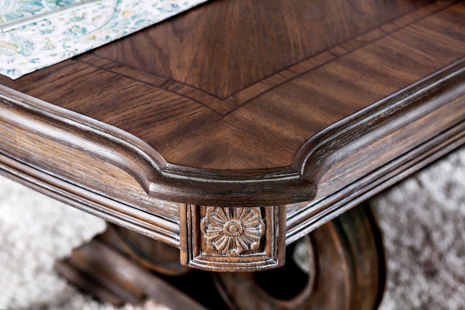 Beautiful wood inlay details and a dramatic trestle base create a grand statement with elegance galore. The ivory fabric upholstery provides a stunning contrast against the rustic natural tone finish for a look that is as cozy as it is chic. Intricate leg designs play beautifully off the delicately cut backs for a look that will inspire and amaze.