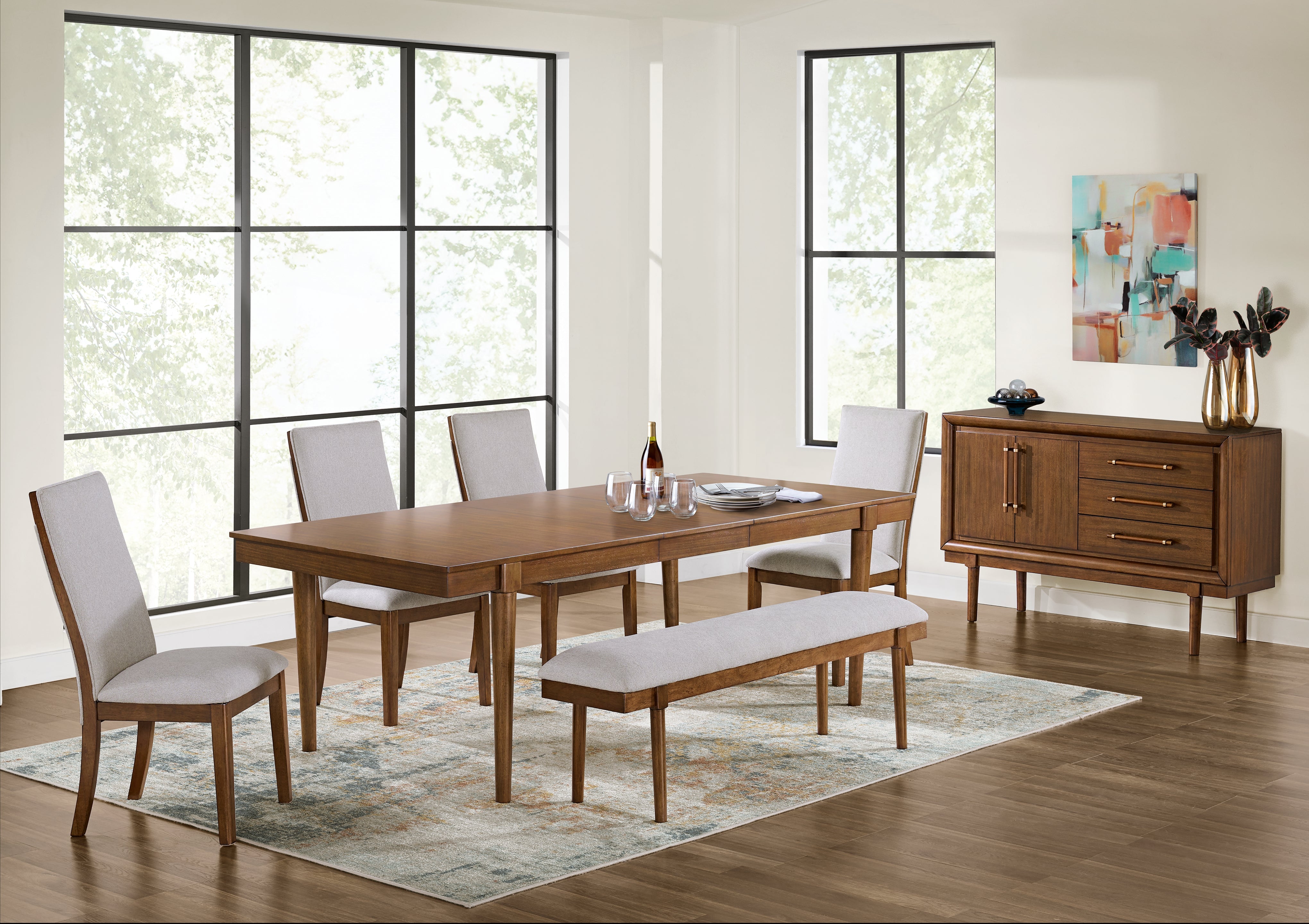 A refreshed take on retro aesthetics. This dining package adds an air of playful simplicity to your dining space, capturing the architectural language of mid-century stylings. The casual, yet timeless, finish on each piece creates completes this study in form and function.