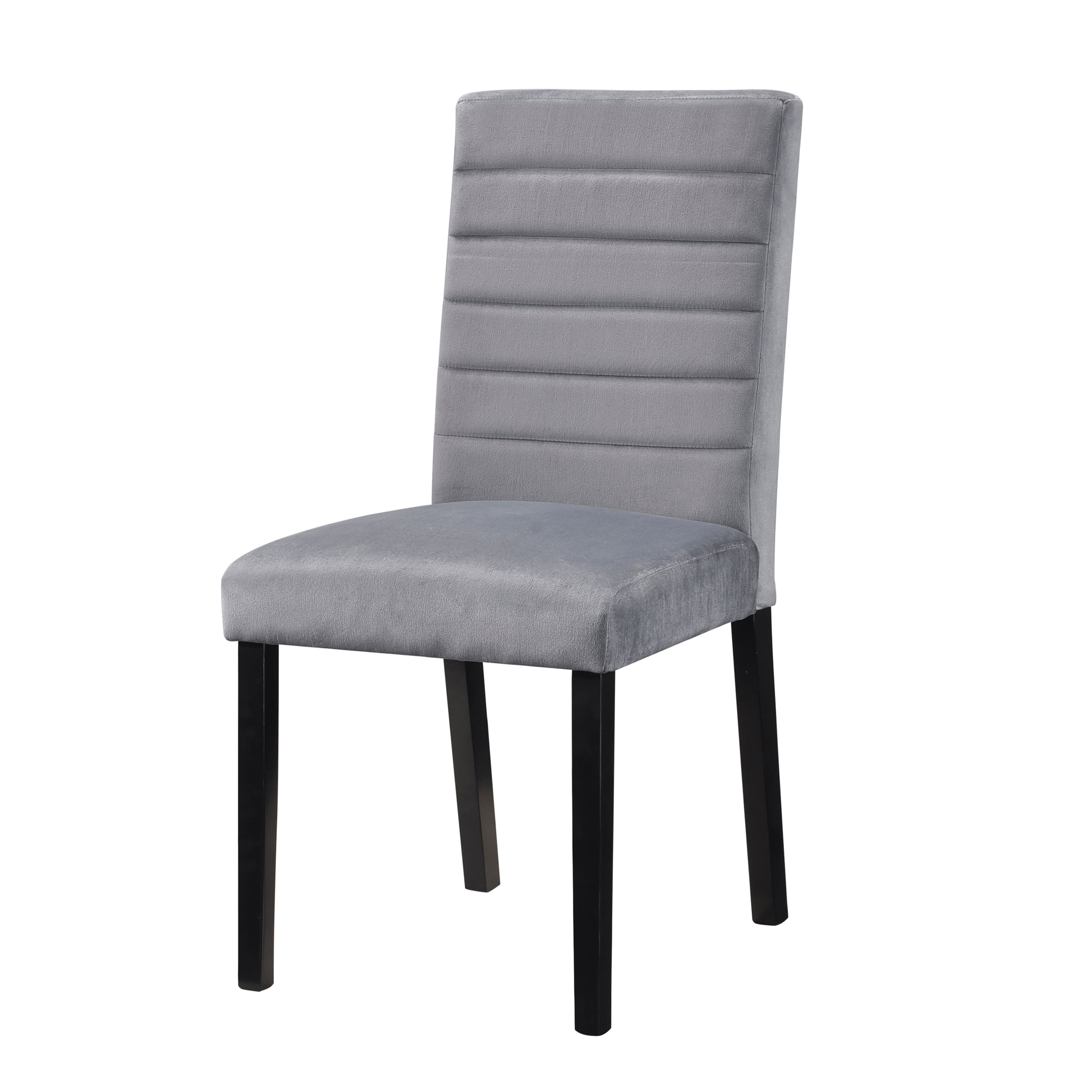 The design of the Andreas Collection is scaled to seat four, making this modern dinette group the perfect addition to your casual dining space. A black finish is utilized over ash veneer highlighting its distinct veneer. Grey upholstered chairs are paired with the table, each featuring horizontal contouring and modern lines.