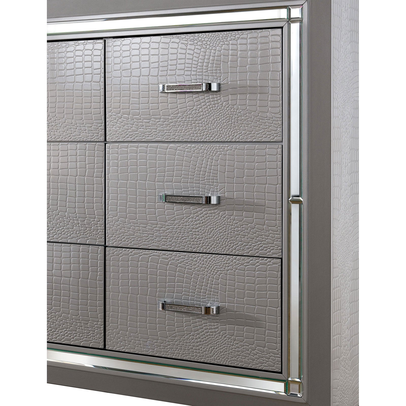 Specifically designed to accentuate a glamorous feel, this bedroom collection brings a combination of class and contemporary style to your bedroom. Crocodile embossed veneer and silver lining panels stand out throughout every piece, including this matching dresser.