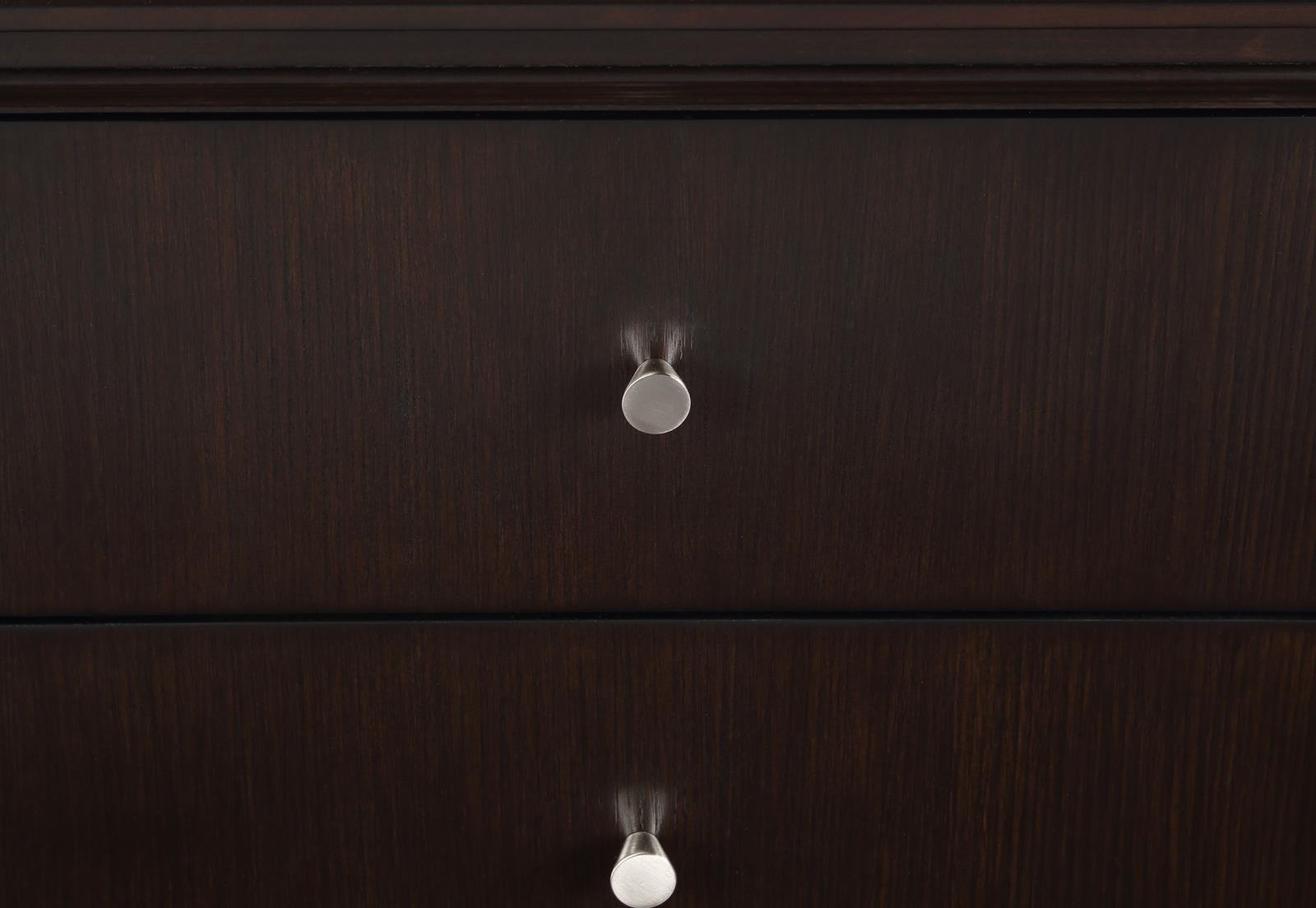 Introduce stylish storage in your bedroom with a modern six-drawer dresser. Its sleek look is accentuated in a dark brown finish, with metallic accents that add depth to tapering feel. Petite knobs decorate each drawer front as drawers offer ample storage for clothing, linens and accessories in your bedroom. The dresser offers a wide top for decor and drawers add protection with felt lining in top drawer and cedar lining and bottom drawers. Add framed photos or a metal sculptural piece to the top of the dresser to add a personal touch.