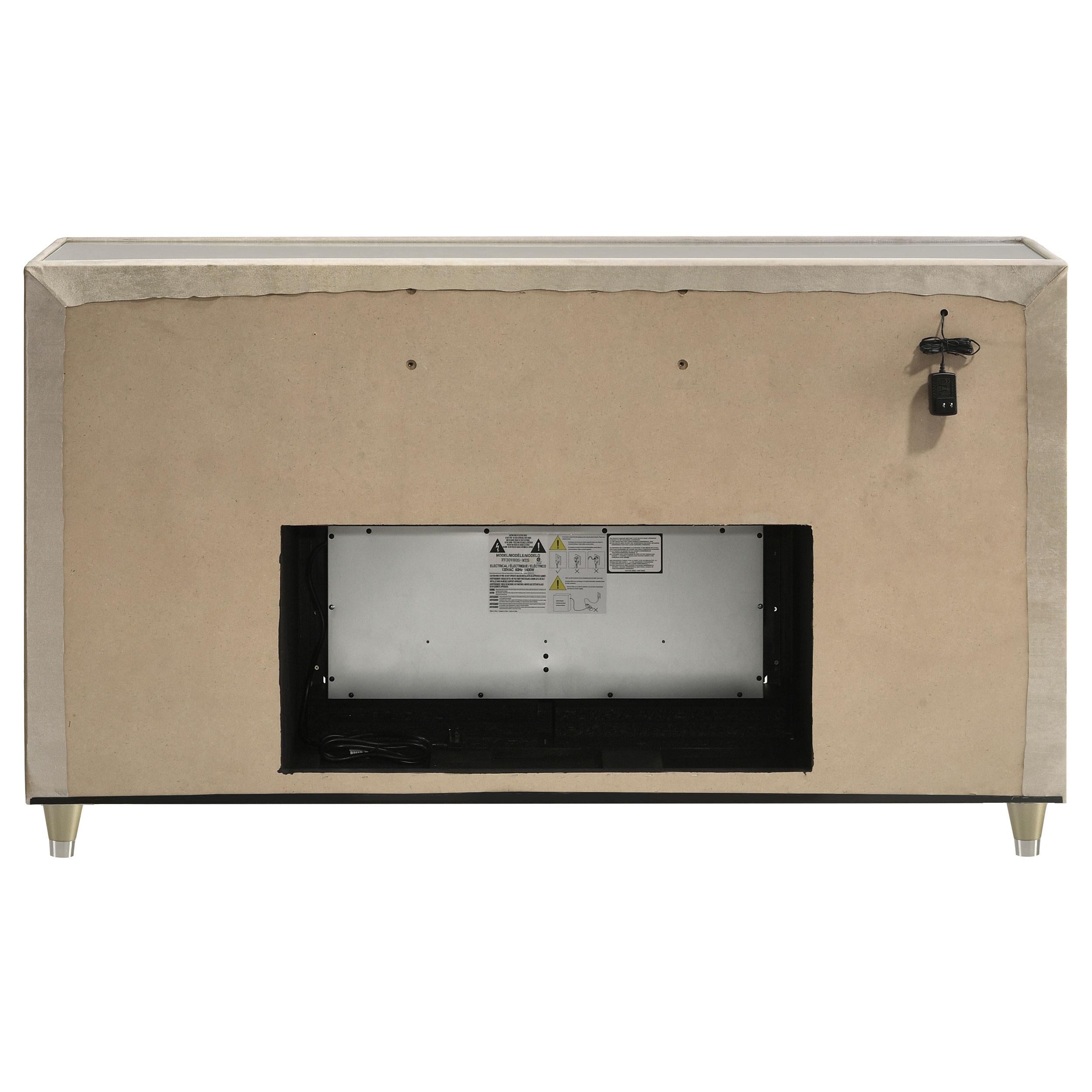 Infuse your space with cozy glamour in this eight-drawer flame box dresser, richly upholstered in ivory and camel velvet. A built-in LED flame visualizer is framed by clear tempered glass and acrylic details, while crystal knobs and quilted velvet drawers shine with elegance. LED case lighting and a wireless remote enhance function, while brown felt-lined top drawers, dovetail joints, and heavy-duty glides provide strength and finesse atop acrylic legs.